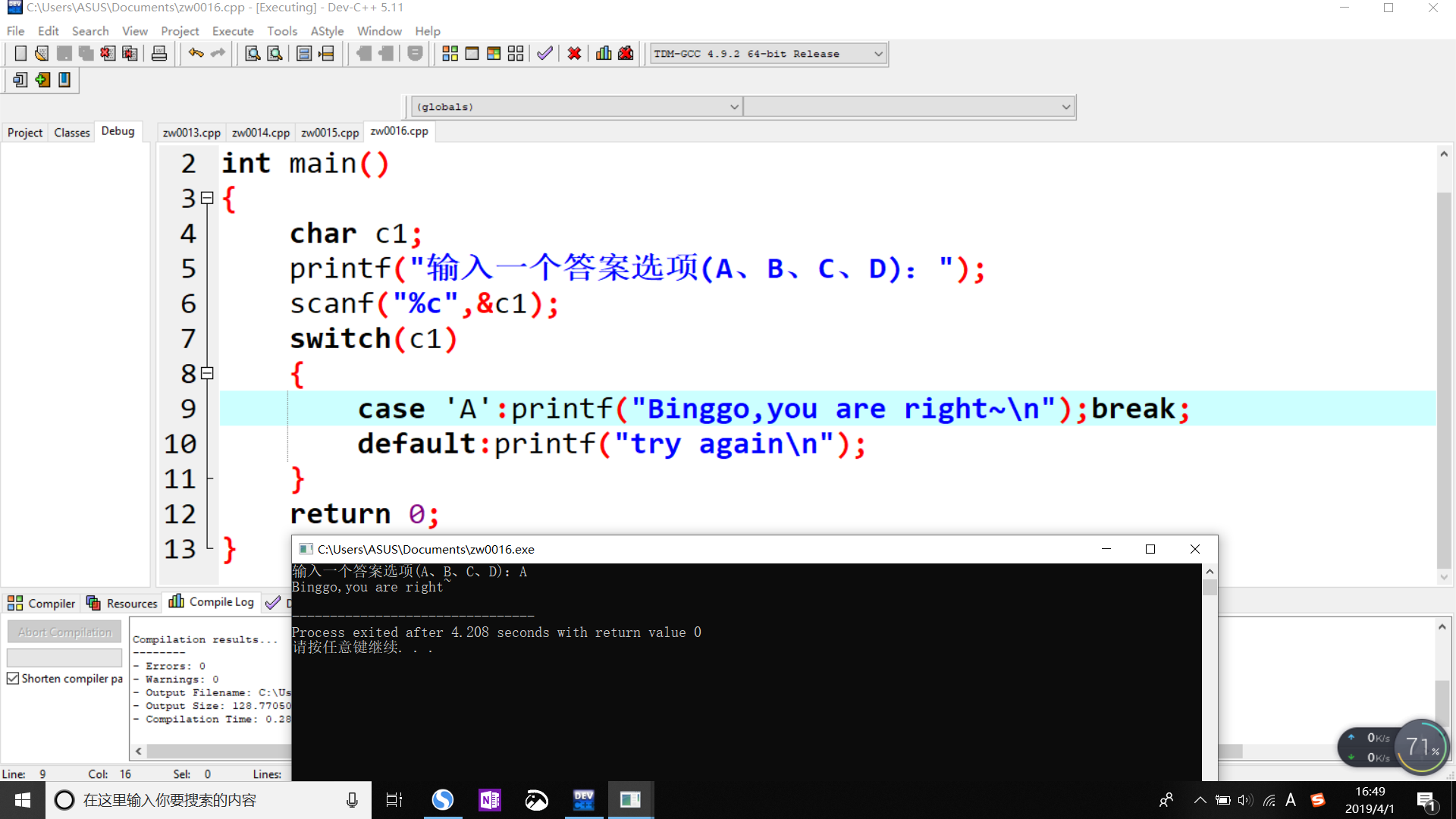 case 'A':printf("Binggo,you are right~\n");break;