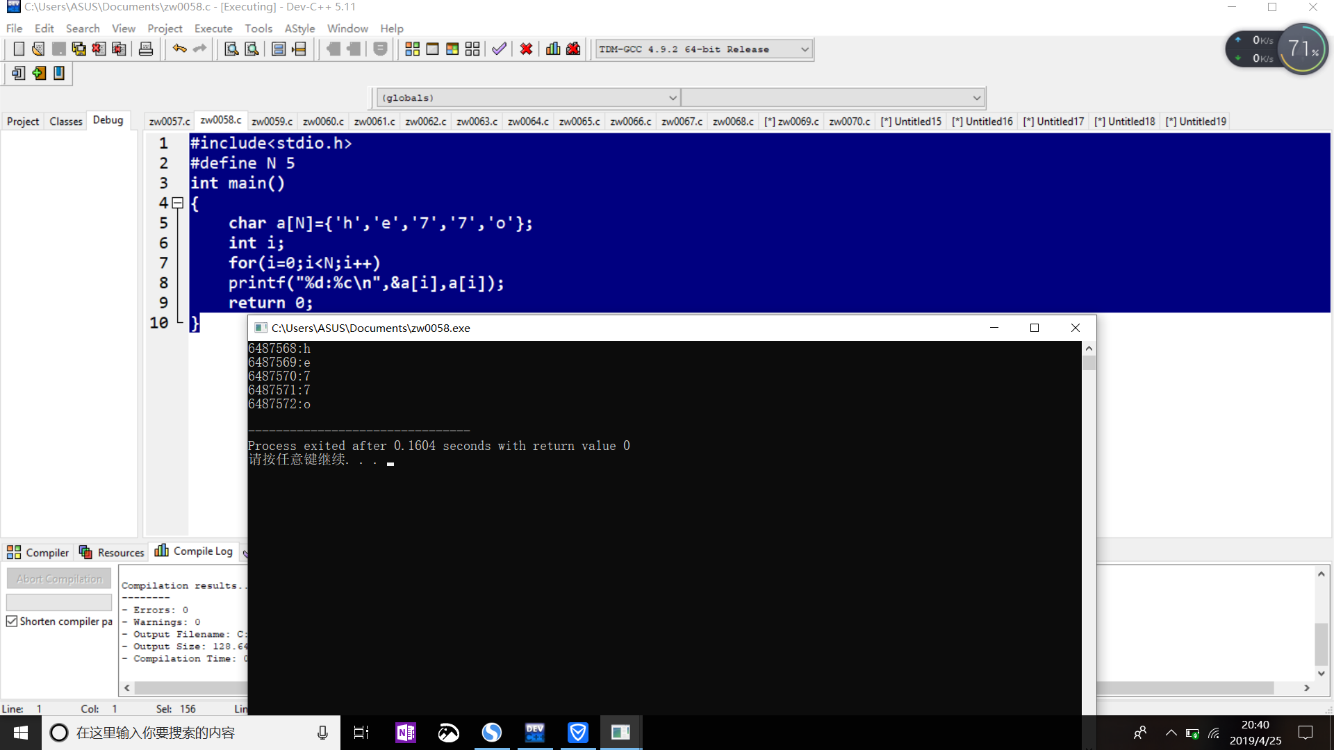 #include<stdio.h> #define N 5 int main() { char a[N]={'h','e','7','7','o'}; int i; for(i=0;i<N;i++) printf("%d:%c\n",&a[i],a[i]); return 0; }