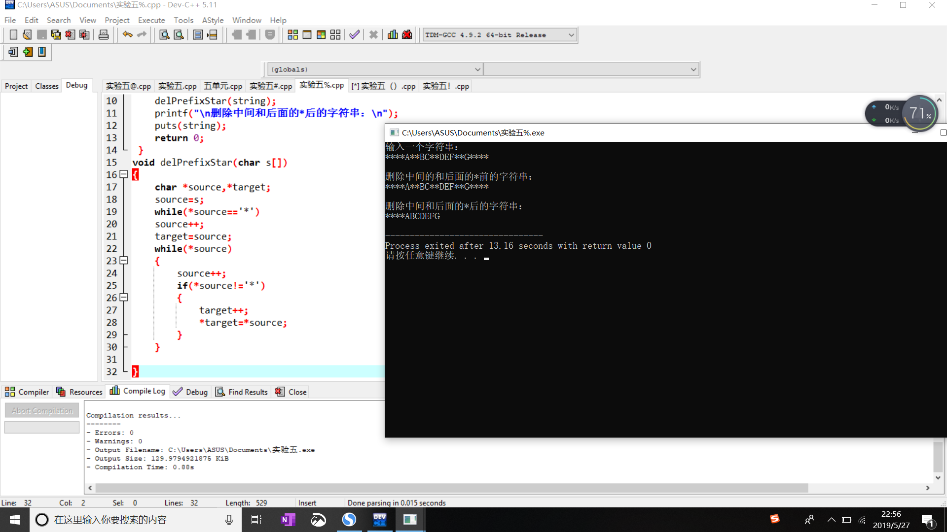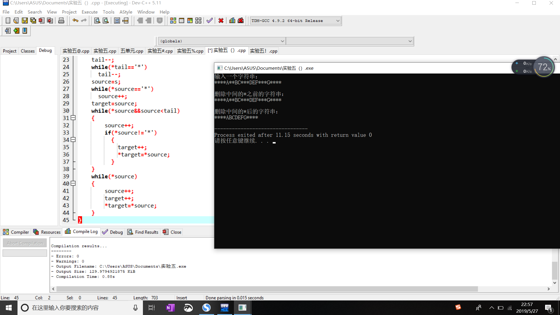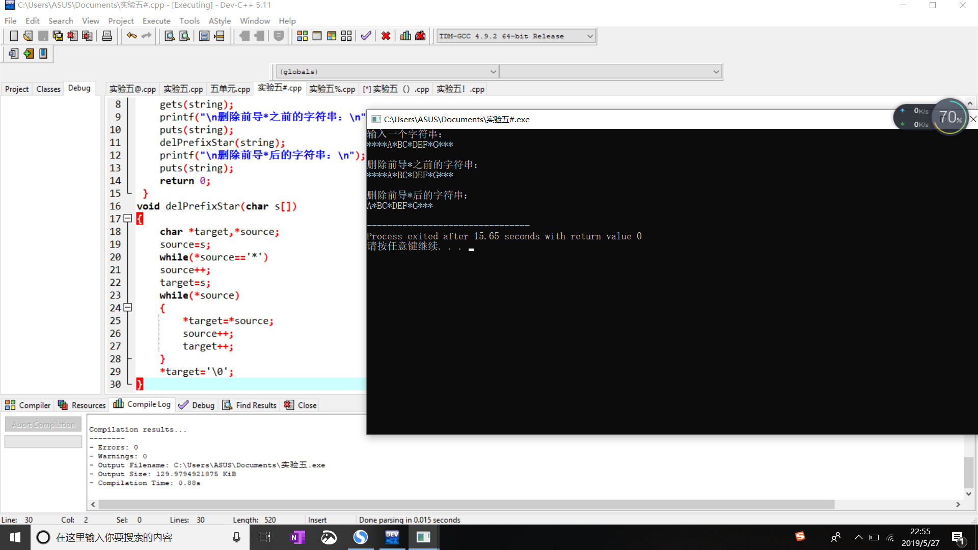 坑:在利用指针删除字符串前导“*”时,在被调用的函数中,一开始没有把*target赋值‘、0’’,认为它指向的变量已经是‘、0’,而这是错误的;如果不人为地操作*target=‘、0’,电脑会自动赋值,产生错误结果;