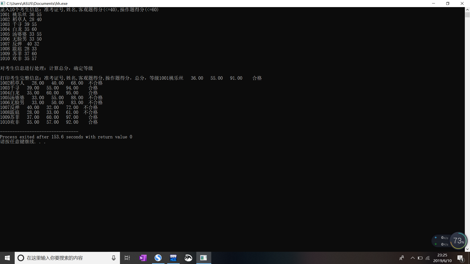 printf("\n打印考生完整信息:准考证号,姓名,客观题得分,操作题得分,总分,等级");