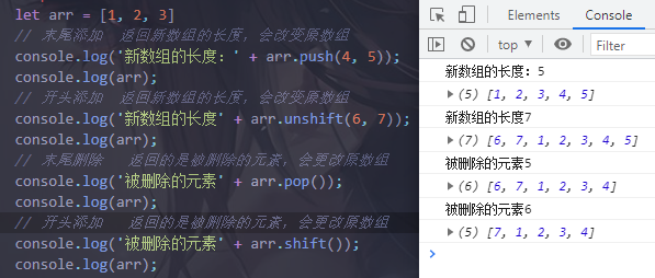 | push(参数1……) | 末尾添加一个或多个元素,注意修改原数组 | 返回新的长度 |