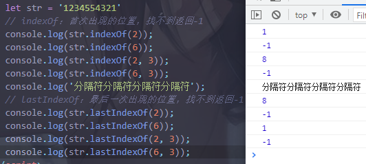 lastIndexOf:查找字符在字符串中最后一次出现的位置并返回下标,如果找不到返回 -1。参数 1 是要查找的元素,参数 2 是开始的位置。从后往前。
