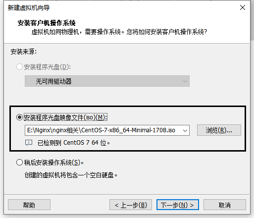 3、 选择程序光盘映像文件(CentOS7.4)。