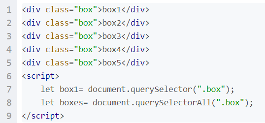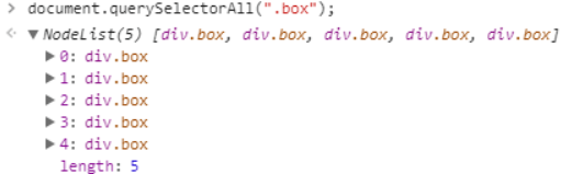 区别: 当有多个class相同的元素时,使用querySelector()方法只能获取到第一个class为box的元素,而querySelectorAll()获取到了所有class为box的元素集合。