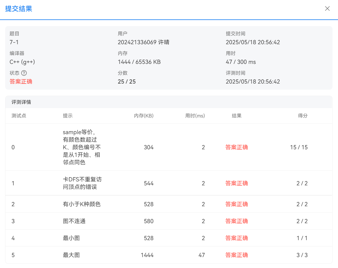 - 问题:图着色问题,起初未严格按题目要求处理顶点和颜色编号(从1开始 ),在构建邻接矩阵和检查颜色时出现逻辑错误。