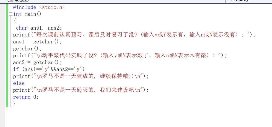 当把源代码line9去掉后重新编译运行的结果: 程序运行到第一个问题后就结束了 。原因: getchar 读取一个字符。当调用 getchar 时,程序会暂停等待用户输入,直到用户按下回车键,输入的字符和换行符(\n)会被放入输入缓冲区,getchar 每次从缓冲区读取一个字符:在第一次调用 getchar 读取用户对 “每次课前认真预习、课后及时复习了没?” 的回答后,用户输入的字符和紧随其后的换行符 \n 被留在了输入缓冲区中。如果此时去掉了用于读取并丢弃换行符的那行 getchar 代码,那么第二次调用 getchar 读取 “动手敲代码实践了没?” 的回答时,它读取的第一个字符实际上是输入缓冲区中的换行符 \n,而不是用户针对第二个问题输入的内容。