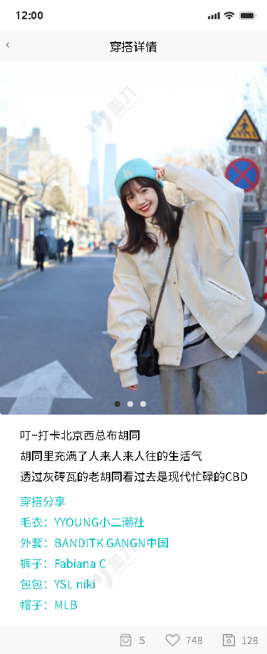 在此界面中用户能够查看具体用户穿搭分享的详细信息。用户通过点击首页其他用户穿搭分享进入该页面。