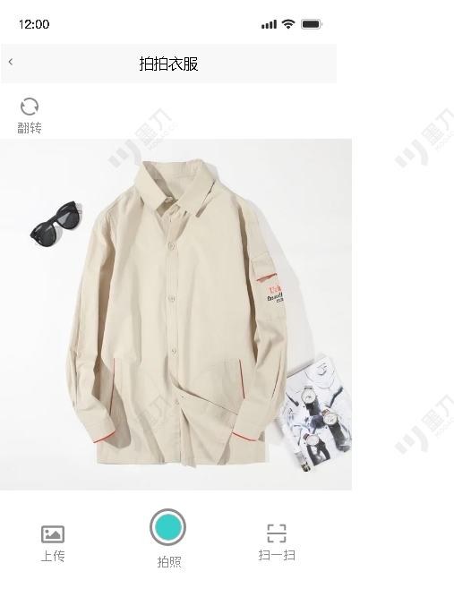 用户点击“拍照上传衣服”界面,可选择“翻转”调整摄像头方向、“拍照”直接拍摄衣物照片,或通过“上传”从相册导入已有图片。系统调用设备摄像头权限完成拍摄后,自动裁剪并识别衣物类型(如上衣、裤子等)、颜色及材质,随后将数据同步至用户“衣柜”。若选择“扫一扫”,系统则通过扫描商品条形码快速获取衣物品牌及款式信息,并关联至商城购买链接。后端服务器存储用户上传的图片及分析结果,用于后续个性化搭配推荐。