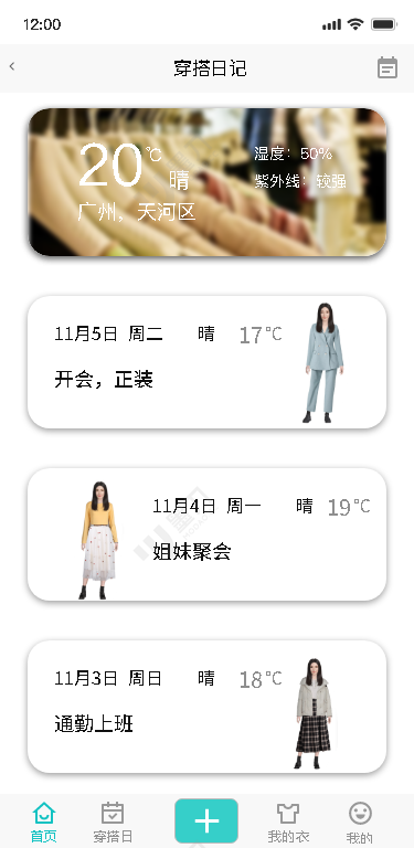 在此界面中用户能够查看以往自己服装穿搭。用户通过点击底部导航栏“穿搭日记”进入该界面。