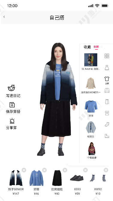 在此界面中用户能够通过衣橱挑选服装进行自由搭配。用户通过点击底部导航栏“+”符号,进入该界面。