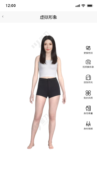 在此界面中用户能够通过上传个人体型数据生成专属虚拟形象,同时可通过各项参数(如“造型优化”、“身材局部”)对虚拟形象进行细微调整,提高虚拟形象与现实形象的统一性。