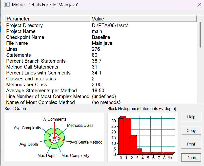 通过 SourceMonitor 对当时代码的分析(如下方图表所示),也能从侧面印证上述问题。从文本信息部分的 “Lines” 可知代码总行数为 276 行,“Statements” 为 80 条,结合 “Percent Branch Statements”(分支语句占比 38.7% )和 “Percent Lines with Comments”(含注释代码行占比 34.1% )等信息,可了解代码整体结构情况。再看图表部分,雷达图能直观展现代码在注释比例、方法数量等多个维度的指标,柱状图则反映出语句数量随代码块深度的分布情况。这些分析数据为我们进一步理解代码的复杂性、查找运行超时根源提供了有力依据。
