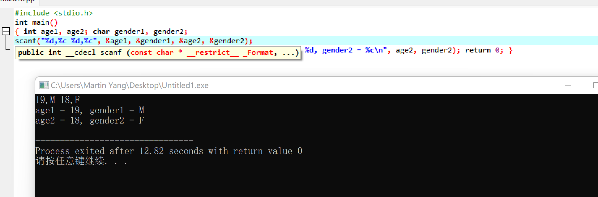 printf("age1 = %d, gender1 = %c\n", age1, gender1); printf("age2 = %d, gender2 = %c\n", age2, gender2); return 0; }