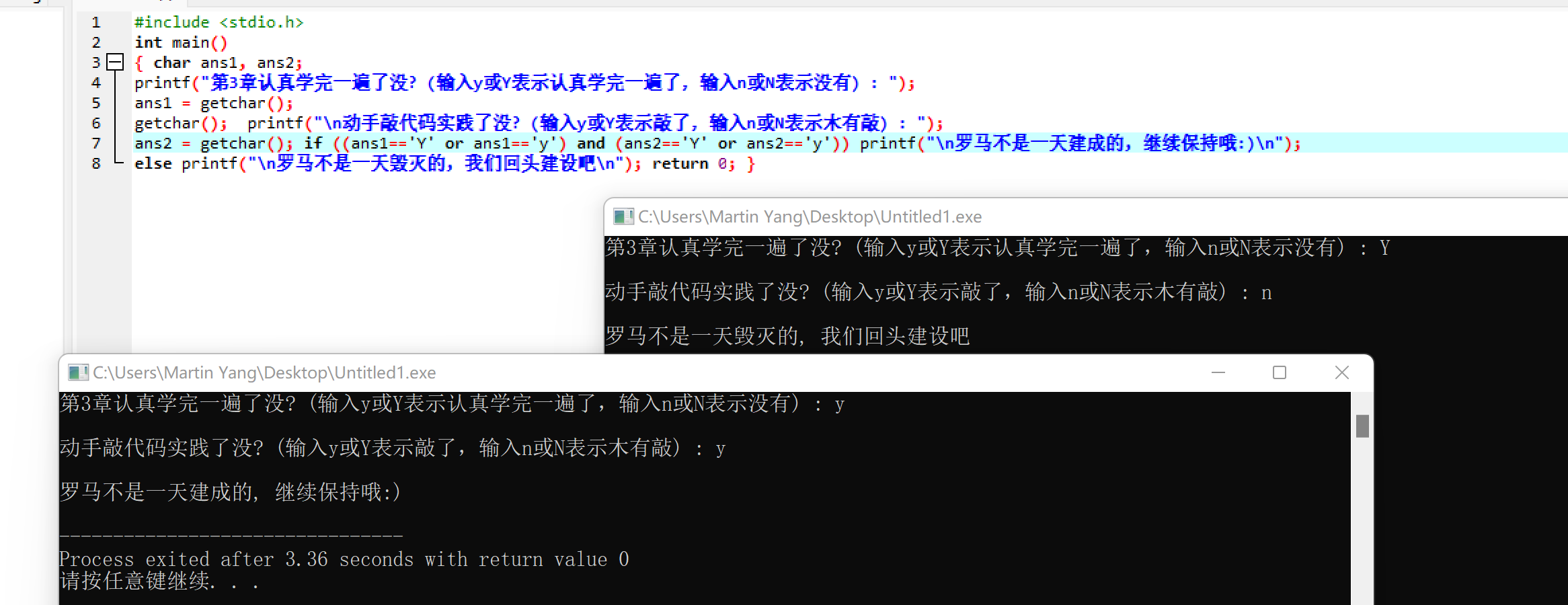 ans2 = getchar(); if ((ans1=='Y' or ans1=='y') and (ans2=='Y' or ans2=='y')) printf("\n罗马不是一天建成的, 继续保持哦:)\n");