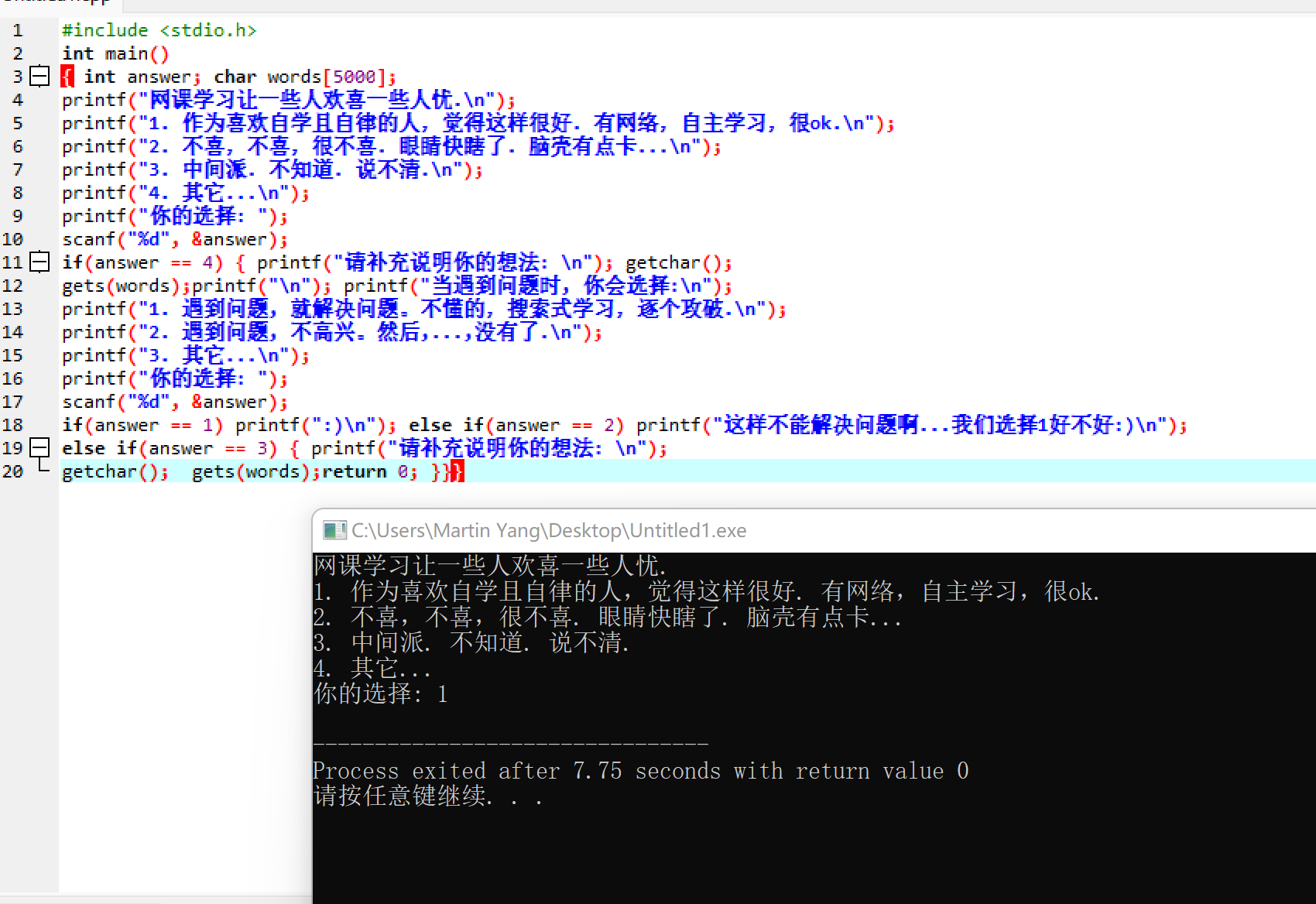 gets(words);printf("\n"); printf("当遇到问题时, 你会选择:\n");