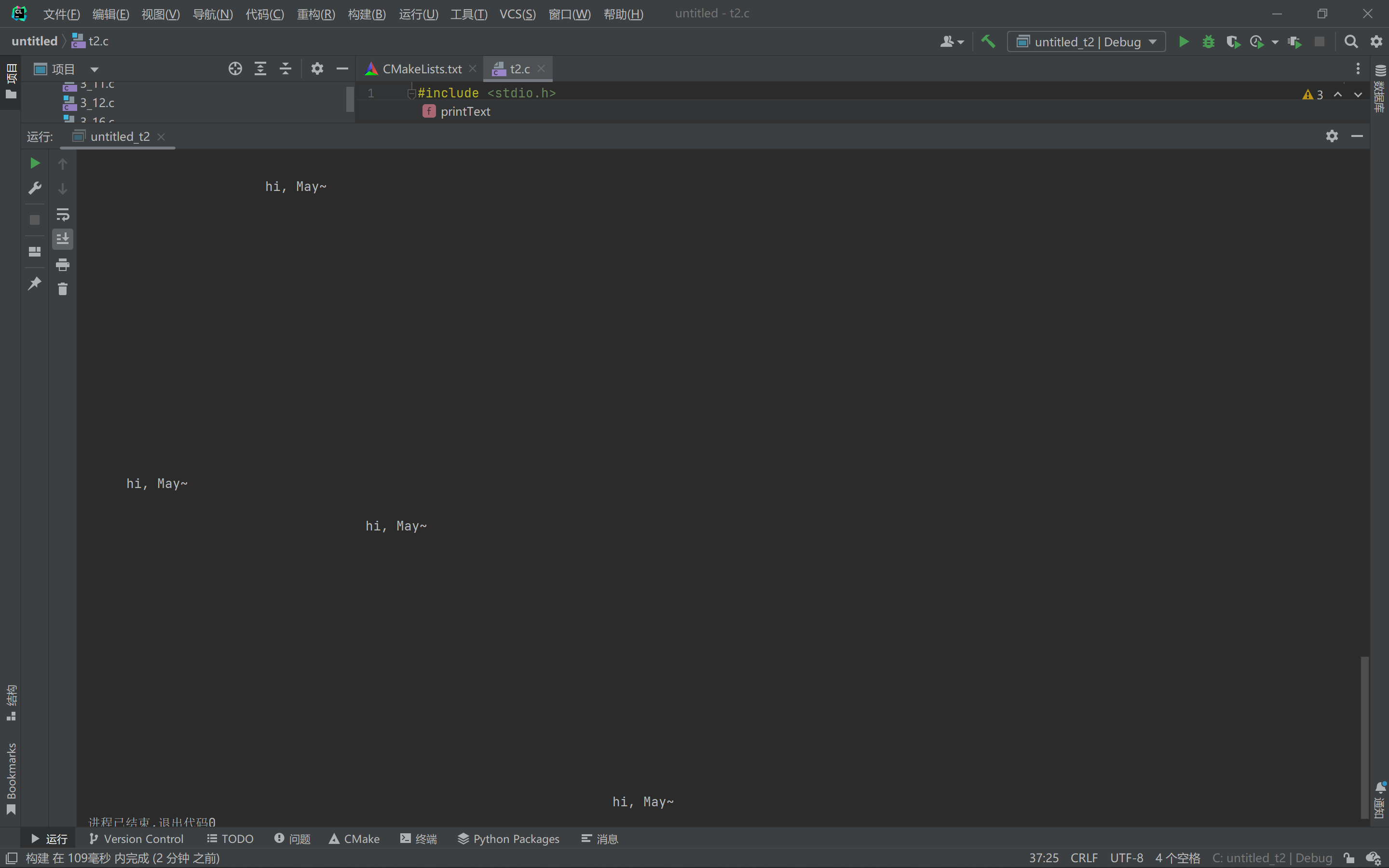 #include <stdio.h> #include <stdlib.h> #include <time.h> #include <windows.h> #define N 80 void printText(int line, int col, char text[]); // 函数声明 void printSpaces(int n); // 函数声明 void printBlankLines(int n); // 函数声明 int main() { int line, col, i; char text[N] = "hi, May~"; srand(time(0)); // 以当前系统时间作为随机种子 for(i=1; i<=10; ++i) { line = rand()%25; col = rand()%80; printText(line, col, text); Sleep(1000); // 暂停1000ms } return 0; }// 打印n个空格 void printSpaces(int n) { int i; for(i=1; i<=n; ++i) printf(" "); }// 打印n行空白行 void printBlankLines(int n) { int i; for(i=1; i<=n; ++i) printf("\n"); }// 在第line行第col列打印一段文本 void printText(int line, int col, char text[]) { printBlankLines(line-1); // 打印n-1行空行/ printSpaces(col-1); // 打印n-1列空格 printf("%s", text); } // Created by Martin Yang on 2022/4/19. //