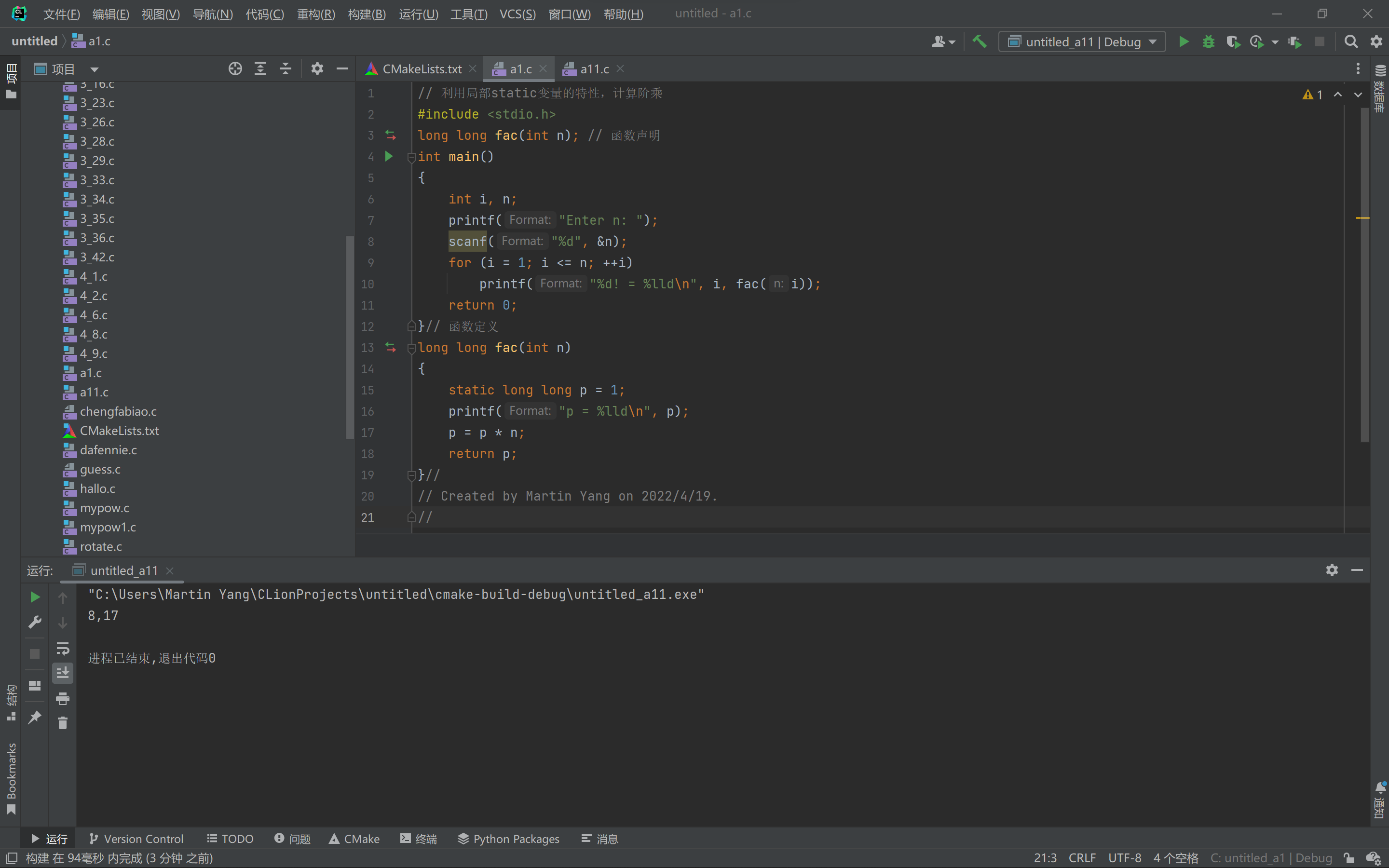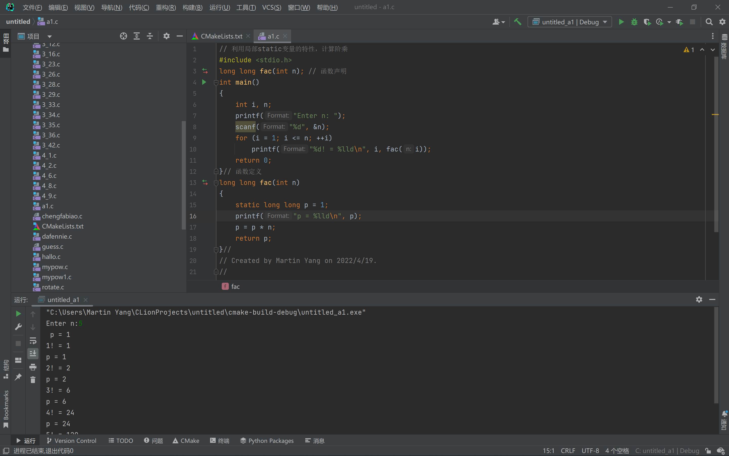 // 利用局部static变量的特性,计算阶乘 #include <stdio.h> long long fac(int n); // 函数声明 int main() { int i, n; printf("Enter n: "); scanf("%d", &n); for (i = 1; i <= n; ++i) printf("%d! = %lld\n", i, fac(i)); return 0; }// 函数定义 long long fac(int n) { static long long p = 1; printf("p = %lld\n", p); p = p * n; return p; }