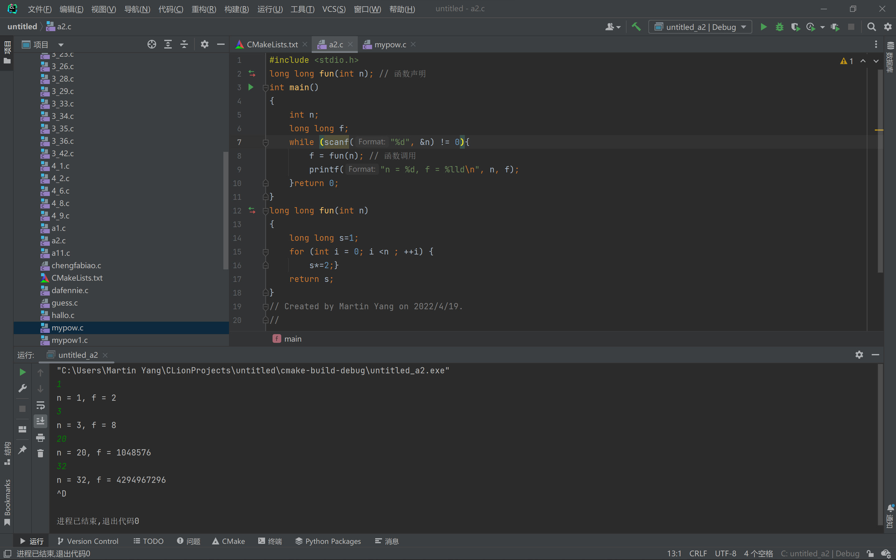 #include <stdio.h> long long fun(int n); // 函数声明 int main() { int n; long long f; while (scanf("%d", &n) != 0){ f = fun(n); // 函数调用 printf("n = %d, f = %lld\n", n, f); }return 0; } long long fun(int n) { long long s=1; for (int i = 0; i <n ; ++i) { s*=2;} return s; } // Created by Martin Yang on 2022/4/19. //