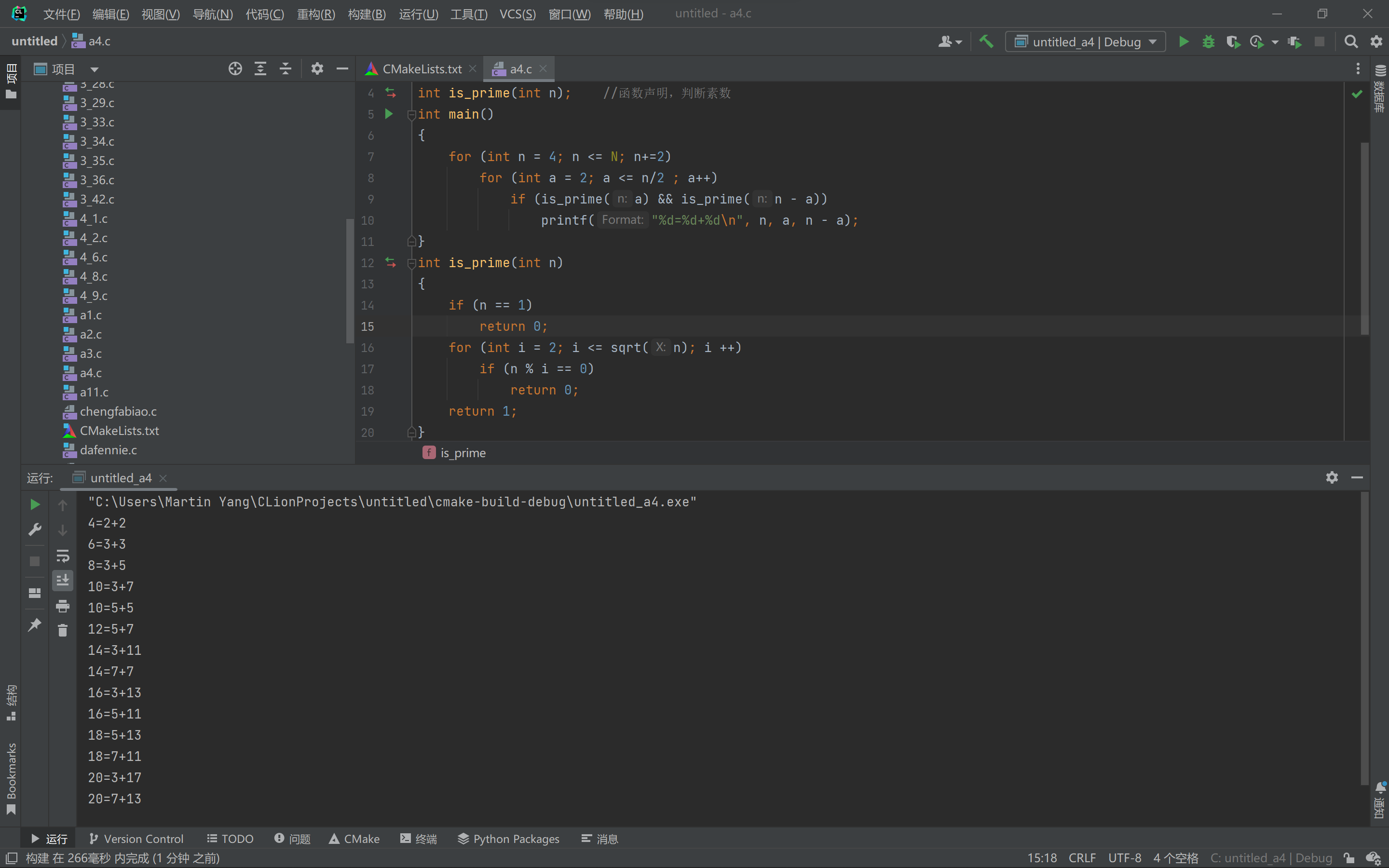 #include <stdio.h> #include <math.h> #define N 20 int is_prime(int n); //函数声明,判断素数 int main() { for (int n = 4; n <= N; n+=2) for (int a = 2; a <= n/2 ; a++) if (is_prime(a) && is_prime(n - a)) printf("%d=%d+%d\n", n, a, n - a); } int is_prime(int n) { if (n == 1) return 0; for (int i = 2; i <= sqrt(n); i ++) if (n % i == 0) return 0; return 1; } // // Created by Martin Yang on 2022/4/19. //