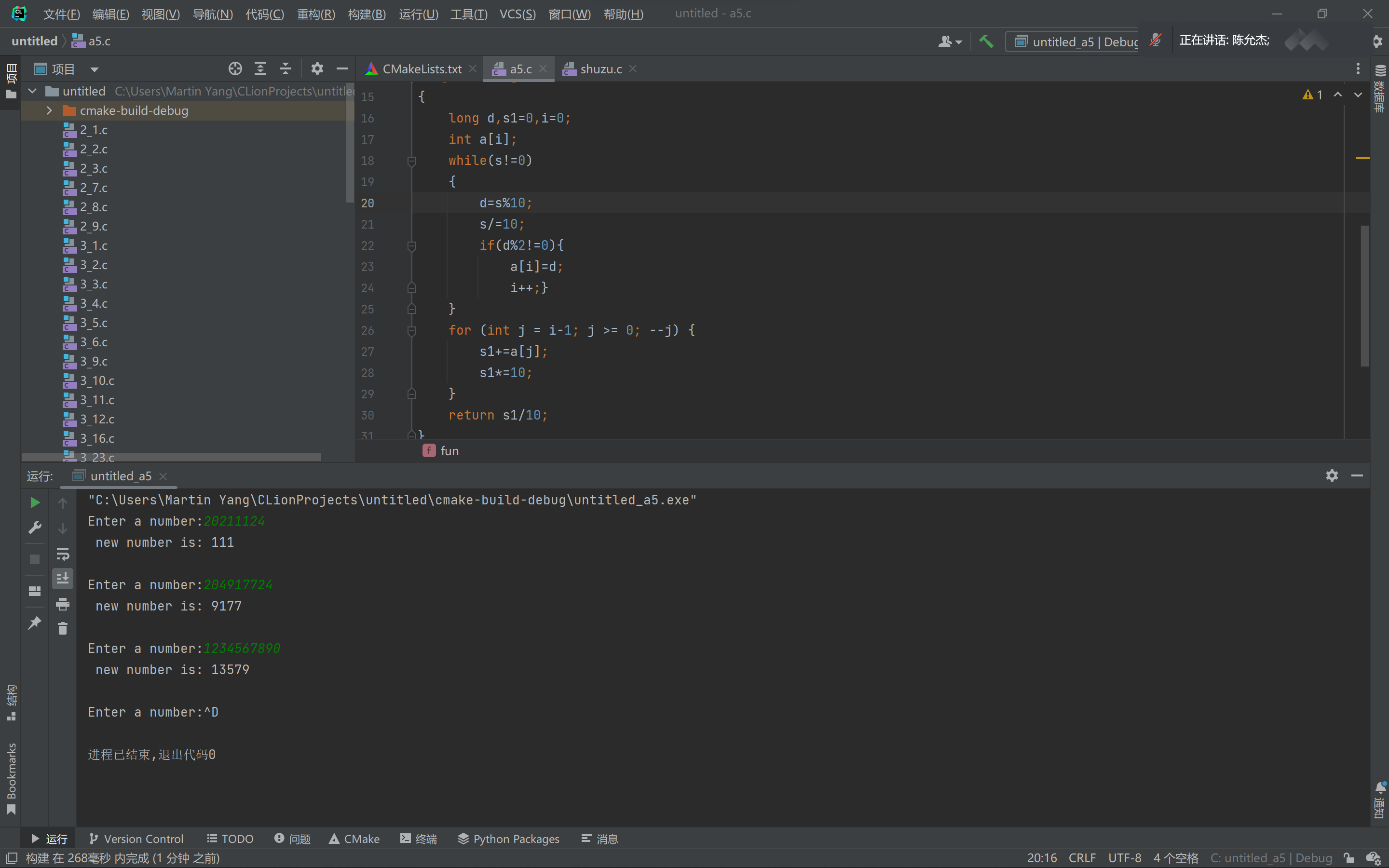 #include <stdio.h> long fun(long s); // 函数声明 int main() { long s, t; printf("Enter a number: "); while (scanf("%ld", &s) !=0) { t = fun(s); // 函数调用 printf("new number is: %ld\n\n", t); printf("Enter a number: "); } return 0; } long fun(long s) { long d,s1=0,i=0; int a[i]; while(s!=0) { d=s%10; s/=10; if(d%2!=0){ a[i]=d; i++;} } for (int j = i-1; j >= 0; --j) { s1+=a[j]; s1*=10; } return s1/10; } // Created by Martin Yang on 2022/4/19. //