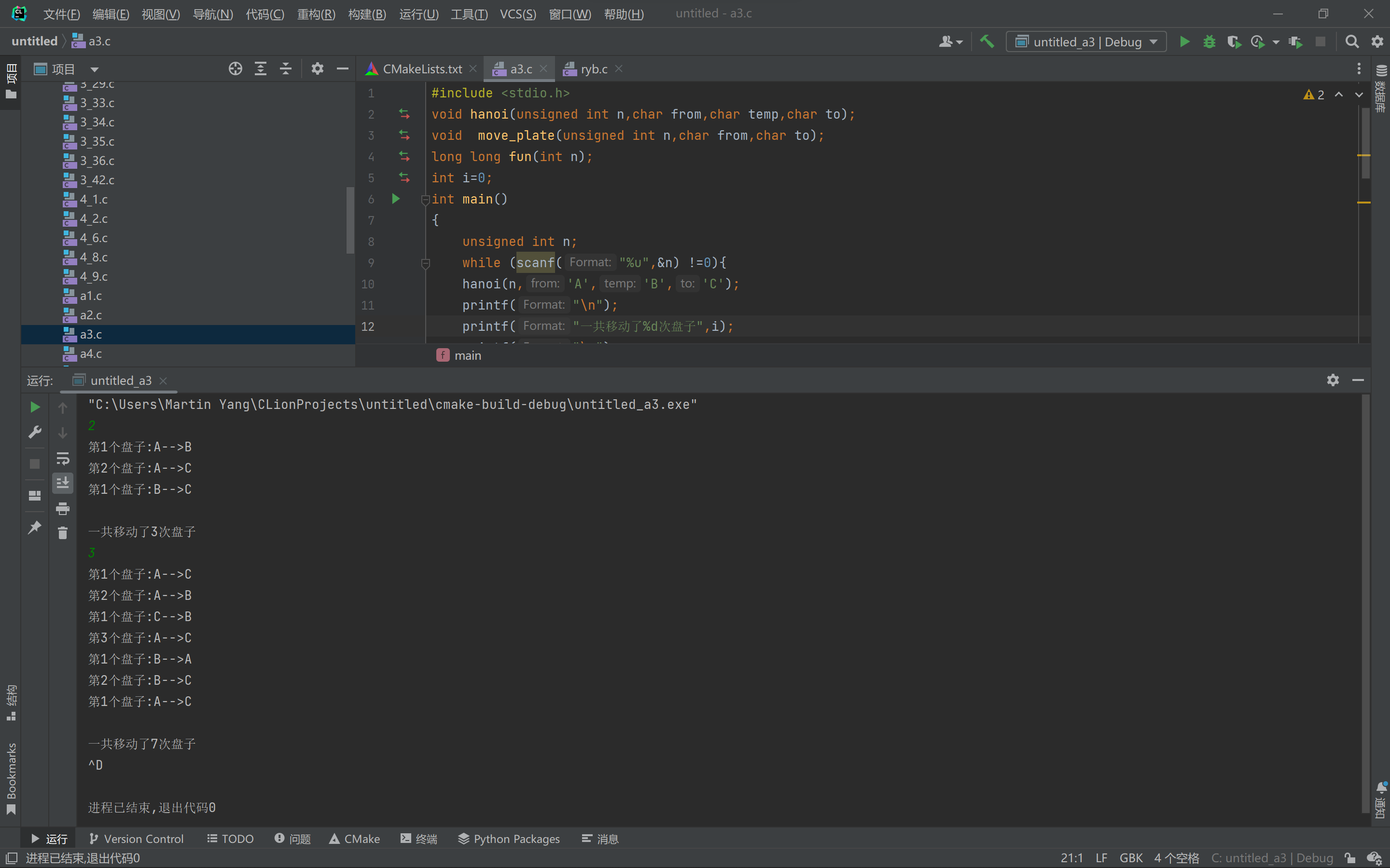 #include <stdio.h> void hanoi(unsigned int n,char from,char temp,char to); void move_plate(unsigned int n,char from,char to); long long fun(int n); int i=0; int main() { unsigned int n; while (scanf("%u",&n) !=0){ hanoi(n,'A','B','C'); printf("\n"); printf("一共移动了%d次盘子",i); printf("\n"); i=0;} return 0; } void hanoi(unsigned int n,char from,char temp,char to) { i++; if(n==1) move_plate(n,from,to); else { hanoi(n-1,from,to,temp); move_plate(n,from,to); hanoi(n-1,temp,from,to); } } void move_plate(unsigned int n,char from,char to) { printf("第%u个盘子:%c-->%c\n",n,from,to); } // Created by Martin Yang on 2022/4/19. //