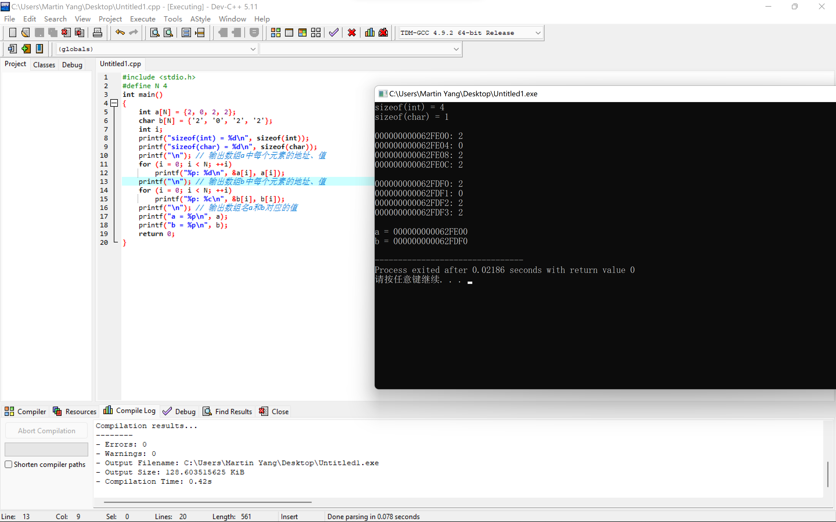 #include <stdio.h> #define N 4 int main() { int a[N] = {2, 0, 2, 2}; char b[N] = {'2', '0', '2', '2'}; int i; printf("sizeof(int) = %d\n", sizeof(int)); printf("sizeof(char) = %d\n", sizeof(char)); printf("\n"); // 输出数组a中每个元素的地址、值 for (i = 0; i < N; ++i) printf("%p: %d\n", &a[i], a[i]); printf("\n"); // 输出数组b中每个元素的地址、值 for (i = 0; i < N; ++i) printf("%p: %c\n", &b[i], b[i]); printf("\n"); // 输出数组名a和b对应的值 printf("a = %p\n", a); printf("b = %p\n", b); return 0; }