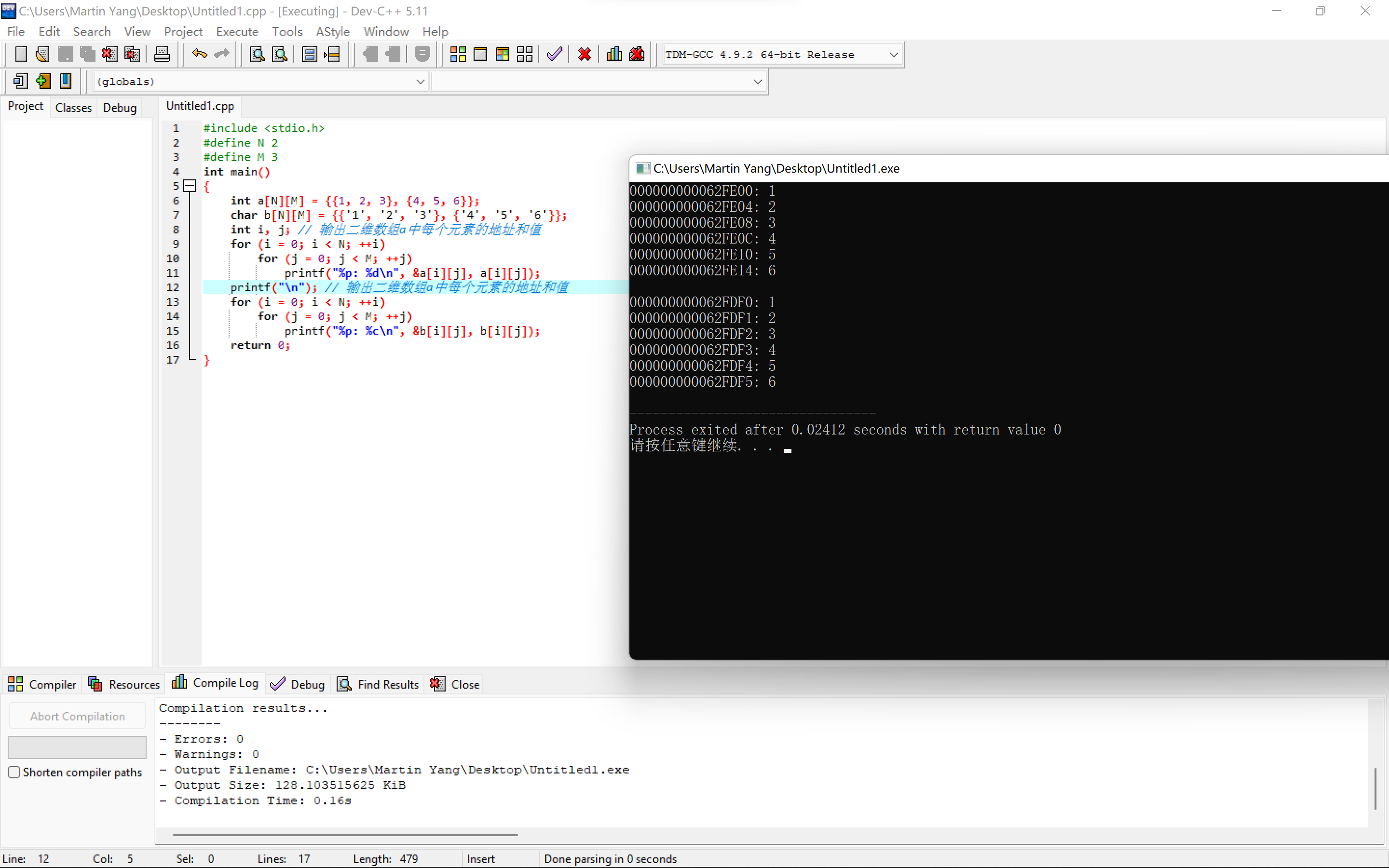 #include <stdio.h> #define N 2 #define M 3 int main() { int a[N][M] = {{1, 2, 3}, {4, 5, 6}}; char b[N][M] = {{'1', '2', '3'}, {'4', '5', '6'}}; int i, j; // 输出二维数组a中每个元素的地址和值 for (i = 0; i < N; ++i) for (j = 0; j < M; ++j) printf("%p: %d\n", &a[i][j], a[i][j]); printf("\n"); // 输出二维数组a中每个元素的地址和值 for (i = 0; i < N; ++i) for (j = 0; j < M; ++j) printf("%p: %c\n", &b[i][j], b[i][j]); return 0; }