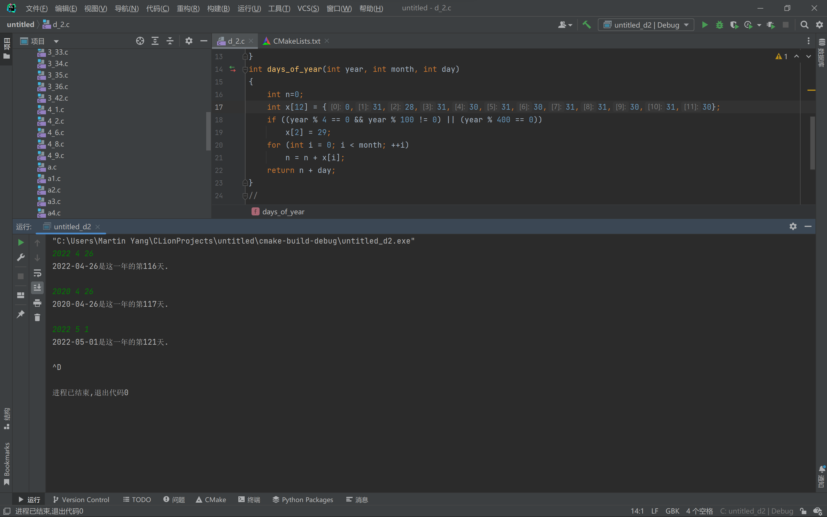 #include <stdio.h> int days_of_year(int year, int month, int day); // 函数声明 int main() { int year, month, day; int days; while(scanf("%d%d%d", &year, &month, &day) != 0) // 按下Ctrl+Z终止 { days = days_of_year(year, month, day); // 函数调用 printf("%4d-%02d-%02d是这一年的第%d天.\n\n", year, month, day, days); } return 0; } int days_of_year(int year, int month, int day) { int n=0; int x[12] = {0,31,28,31,30,31,30,31,31,30,31,30}; if ((year % 4 == 0 && year % 100 != 0) || (year % 400 == 0)) x[2] = 29; for (int i = 0; i < month; ++i) n = n + x[i]; return n + day; } // // Created by Martin Yang on 2022/5/7. //