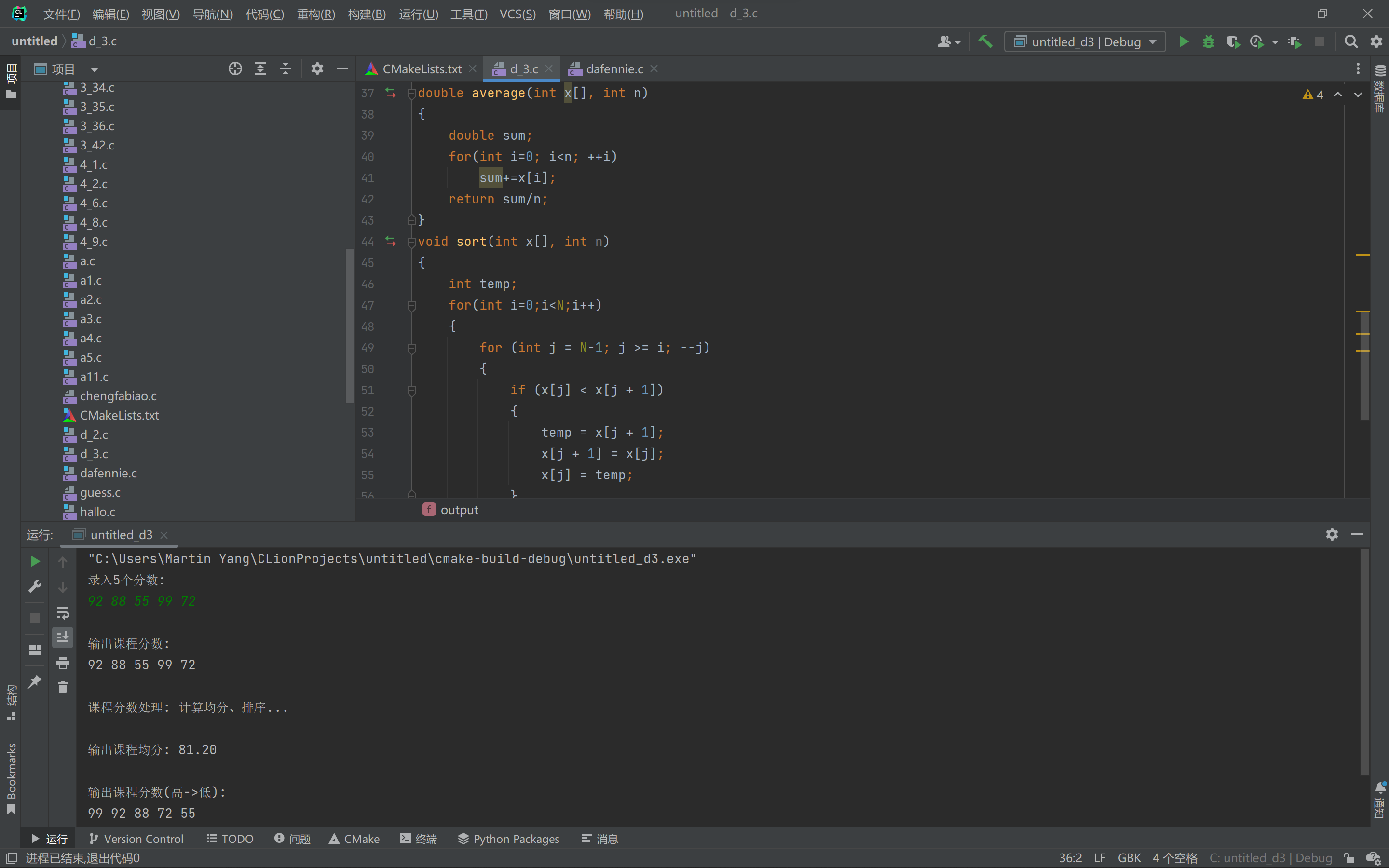 #include <stdio.h> #define N 5 void input(int x[], int n); void output(int x[], int n); double average(int x[], int n); void sort(int x[], int n); int main() { int scores[N]; double ave; printf("录入%d个分数:\n", N); input(scores, N); printf("\n输出课程分数: \n"); output(scores, N); printf("\n课程分数处理: 计算均分、排序...\n"); ave = average(scores, N); sort(scores, N); printf("\n输出课程均分: %.2f\n", ave); printf("\n输出课程分数(高->低):\n"); output(scores, N); return 0; } // 输入n个整数保存到整型数组x中 void input(int x[], int n) { int i; for(i=0; i<n; ++i) scanf("%d", &x[i]); } // 输出整型数组x中n个元素 void output(int x[], int n) { int i; for(i=0; i<n; ++i) printf("%d ", x[i]); printf("\n"); } // 计算整型数组x中n个元素均值,并返回 double average(int x[], int n) { double sum; for(int i=0; i<n; ++i) sum+=x[i]; return sum/n; } // 对整型数组x中的n个元素降序排序 void sort(int x[], int n) { int temp; for(int i=0;i<N;i++) { for (int j = N-1; j >= i; --j) { if (x[j] < x[j + 1]) { temp = x[j + 1]; x[j + 1] = x[j]; x[j] = temp; } } } } // // Created by Martin Yang on 2022/5/7. //