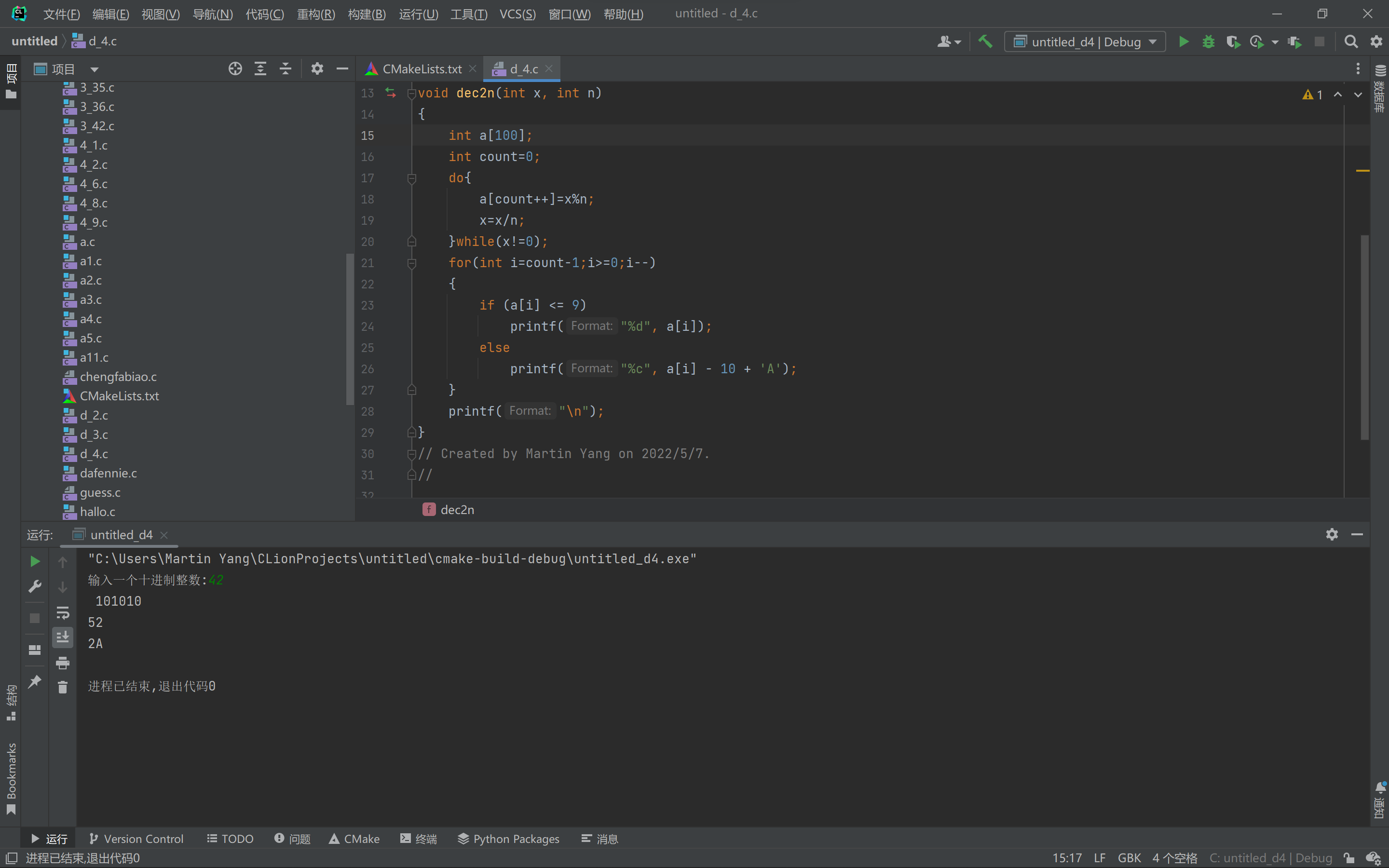 #include <stdio.h> void dec2n(int x, int n); // 函数声明 int main() { int x; printf("输入一个十进制整数: "); scanf("%d", &x); dec2n(x, 2); // 函数调用: 把x转换成二进制输出 dec2n(x, 8); // 函数调用: 把x转换成八进制输出 dec2n(x, 16); // 函数调用: 把x转换成十六进制输出 return 0; }// 函数定义 // 功能: 把十进制数x转换成n进制,打印输出 // 补足函数实现 void dec2n(int x, int n) { int a[100]; int count=0; do{ a[count++]=x%n; x=x/n; }while(x!=0); for(int i=count-1;i>=0;i--) { if (a[i] <= 9) printf("%d", a[i]); else printf("%c", a[i] - 10 + 'A'); } printf("\n"); } // Created by Martin Yang on 2022/5/7. //