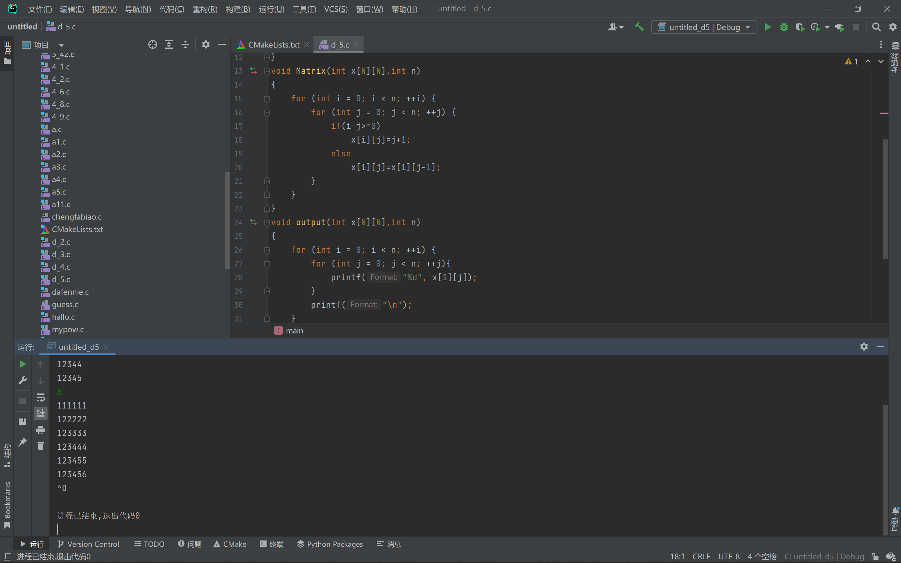 #include <stdio.h> #define N 100 void Matrix(int x[N][N],int n); void output(int x[N][N],int n); int main() { int x[N][N],n; while (scanf("%d",&n) !=0){ Matrix(x,n); output(x,n);} return 0; } void Matrix(int x[N][N],int n) { for (int i = 0; i < n; ++i) { for (int j = 0; j < n; ++j) { if(i-j>=0) x[i][j]=j+1; else x[i][j]=x[i][j-1]; } } } void output(int x[N][N],int n) { for (int i = 0; i < n; ++i) { for (int j = 0; j < n; ++j){ printf("%d", x[i][j]); } printf("\n"); } } // // Created by Martin Yang on 2022/5/7. //
