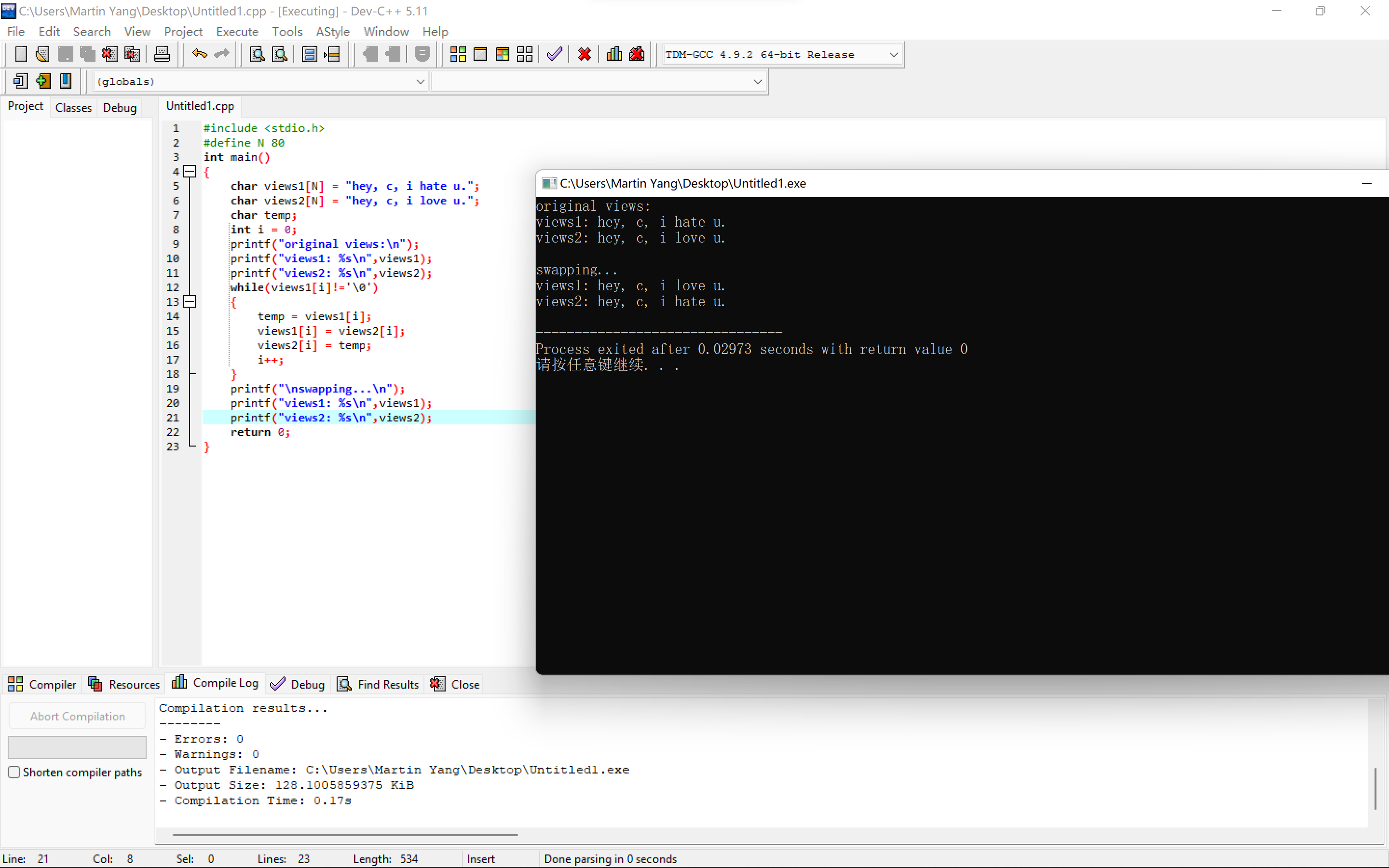 #include <stdio.h> #define N 80 int main() { char views1[N] = "hey, c, i hate u."; char views2[N] = "hey, c, i love u."; char temp; int i = 0; printf("original views:\n"); printf("views1: %s\n",views1); printf("views2: %s\n",views2); while(views1[i]!='\0') { temp = views1[i]; views1[i] = views2[i]; views2[i] = temp; i++; } printf("\nswapping...\n"); printf("views1: %s\n",views1); printf("views2: %s\n",views2); return 0; }