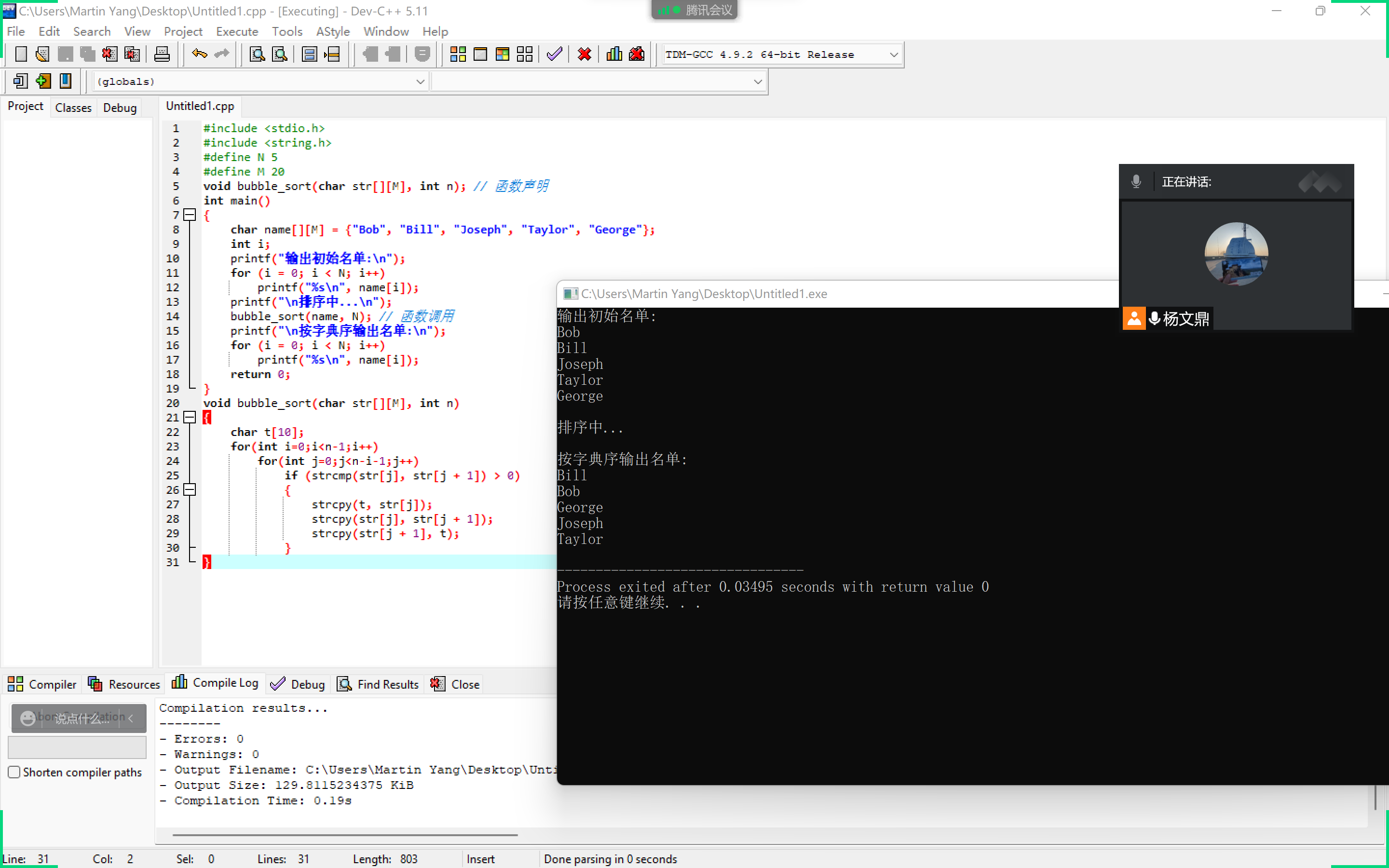 #include <stdio.h> #include <string.h> #define N 5 #define M 20 void bubble_sort(char str[][M], int n); // 函数声明 int main() { char name[][M] = {"Bob", "Bill", "Joseph", "Taylor", "George"}; int i; printf("输出初始名单:\n"); for (i = 0; i < N; i++) printf("%s\n", name[i]); printf("\n排序中...\n"); bubble_sort(name, N); // 函数调用 printf("\n按字典序输出名单:\n"); for (i = 0; i < N; i++) printf("%s\n", name[i]); return 0; } void bubble_sort(char str[][M], int n) { char t[10]; for(int i=0;i<n-1;i++) for(int j=0;j<n-i-1;j++) if (strcmp(str[j], str[j + 1]) > 0) { strcpy(t, str[j]); strcpy(str[j], str[j + 1]); strcpy(str[j + 1], t); } }