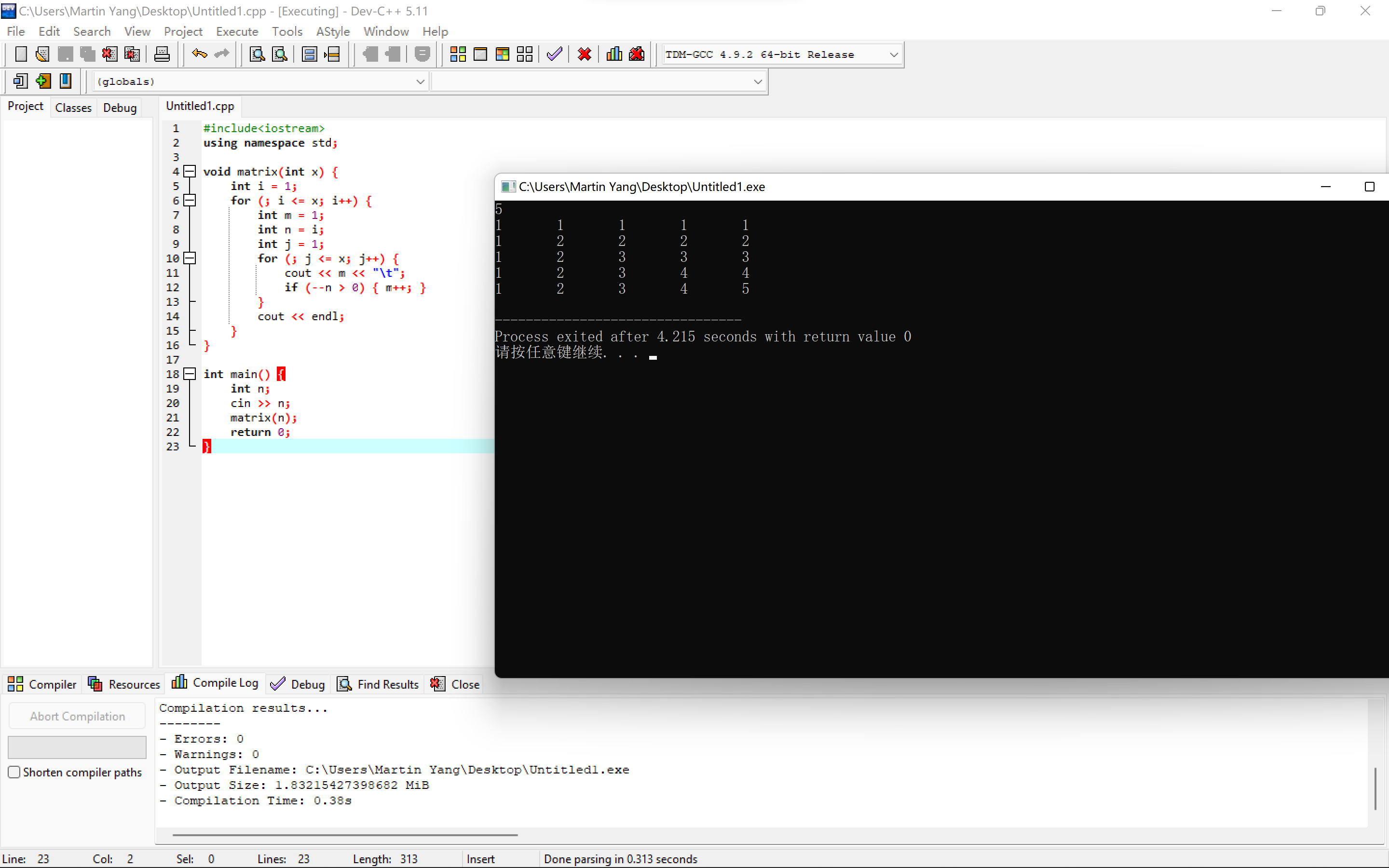 #include<iostream> using namespace std; void matrix(int x) { int i = 1; for (; i <= x; i++) { int m = 1; int n = i; int j = 1; for (; j <= x; j++) { cout << m << "\t"; if (--n > 0) { m++; } } cout << endl; } } int main() { int n; cin >> n; matrix(n); return 0; }