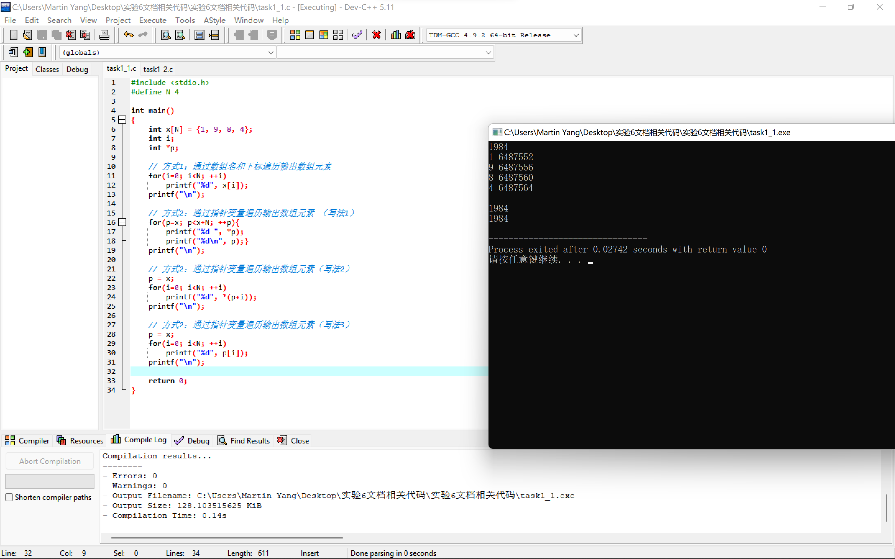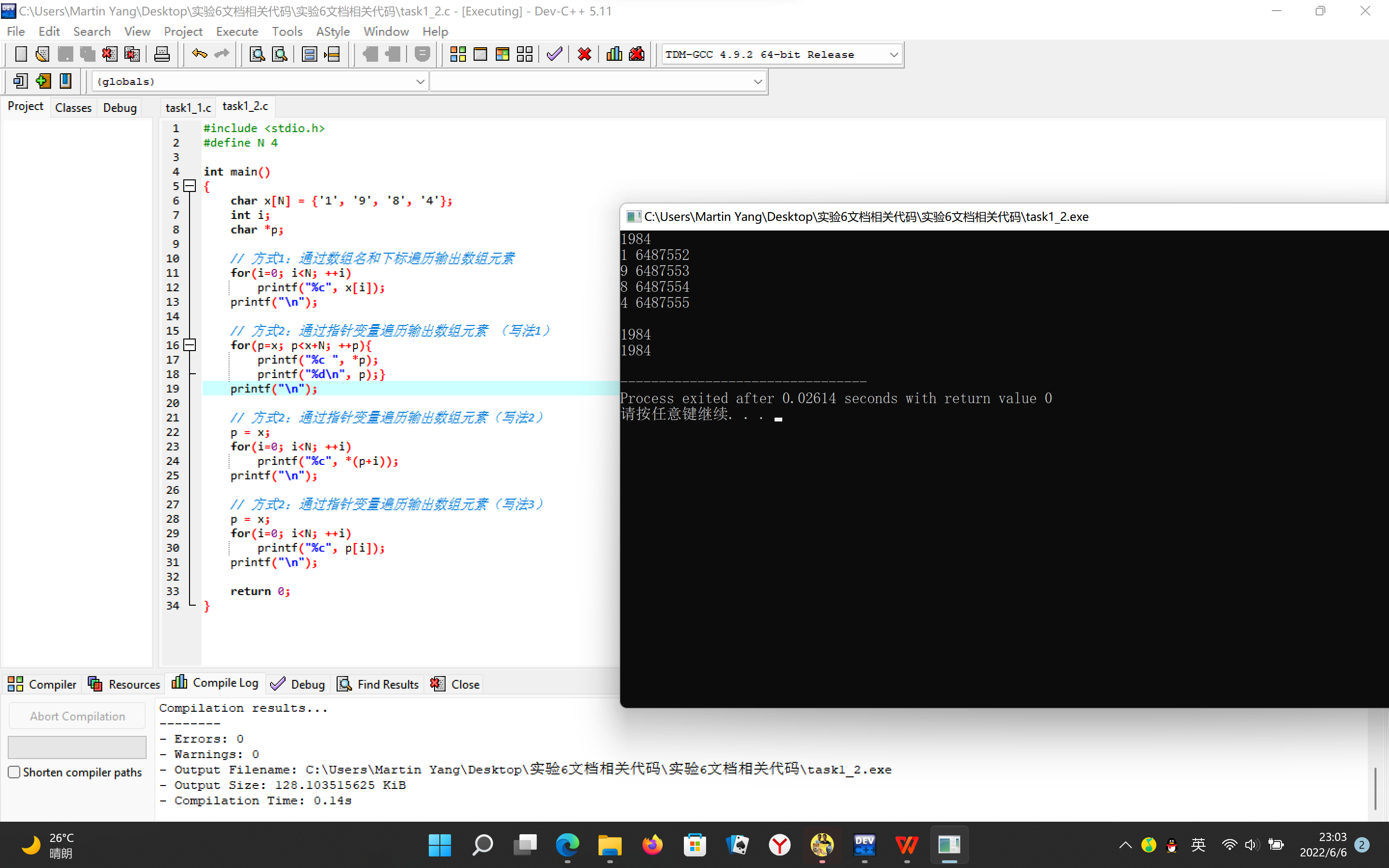 #include <stdio.h> #define N 4 int main() { char x[N] = {'1', '9', '8', '4'}; int i; char *p; // 方式1:通过数组名和下标遍历输出数组元素 for(i=0; i<N; ++i) printf("%c", x[i]); printf("\n"); // 方式2:通过指针变量遍历输出数组元素 (写法1) for(p=x; p<x+N; ++p){ printf("%c ", *p); printf("%d\n", p);} printf("\n"); // 方式2:通过指针变量遍历输出数组元素(写法2) p = x; for(i=0; i<N; ++i) printf("%c", *(p+i)); printf("\n"); // 方式2:通过指针变量遍历输出数组元素(写法3) p = x; for(i=0; i<N; ++i) printf("%c", p[i]); printf("\n"); return 0; }