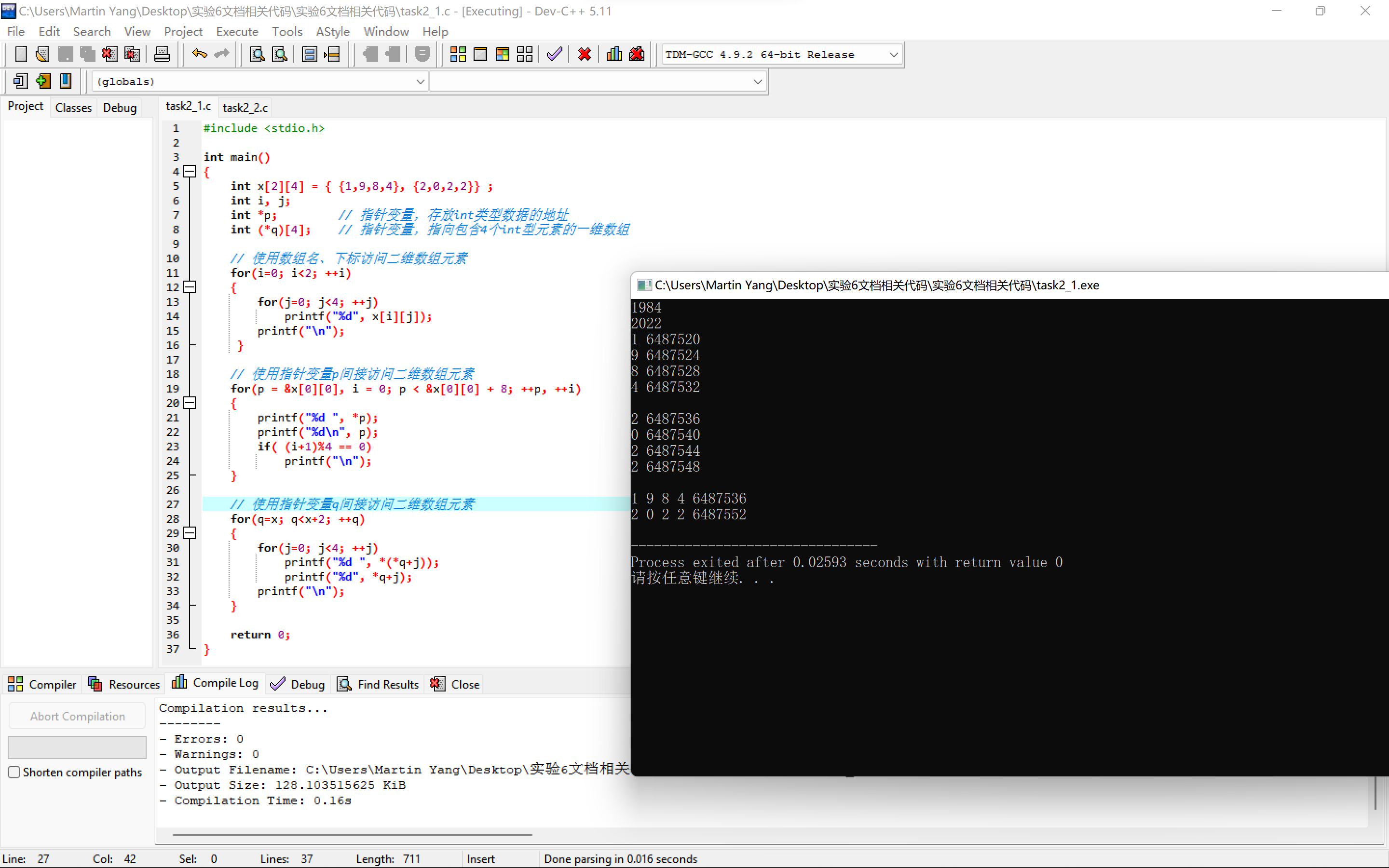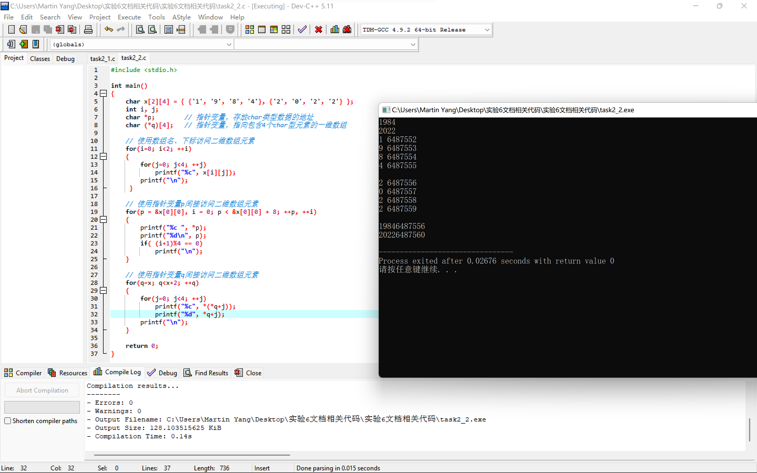 #include <stdio.h> int main() { char x[2][4] = { {'1', '9', '8', '4'}, {'2', '0', '2', '2'} }; int i, j; char *p; // 指针变量,存放char类型数据的地址 char (*q)[4]; // 指针变量,指向包含4个char型元素的一维数组 // 使用数组名、下标访问二维数组元素 for(i=0; i<2; ++i) { for(j=0; j<4; ++j) printf("%c", x[i][j]); printf("\n"); } // 使用指针变量p间接访问二维数组元素 for(p = &x[0][0], i = 0; p < &x[0][0] + 8; ++p, ++i) { printf("%c ", *p); printf("%d\n", p); if( (i+1)%4 == 0) printf("\n"); } // 使用指针变量q间接访问二维数组元素 for(q=x; q<x+2; ++q) { for(j=0; j<4; ++j) printf("%c", *(*q+j)); printf("%d", *q+j); printf("\n"); } return 0; }