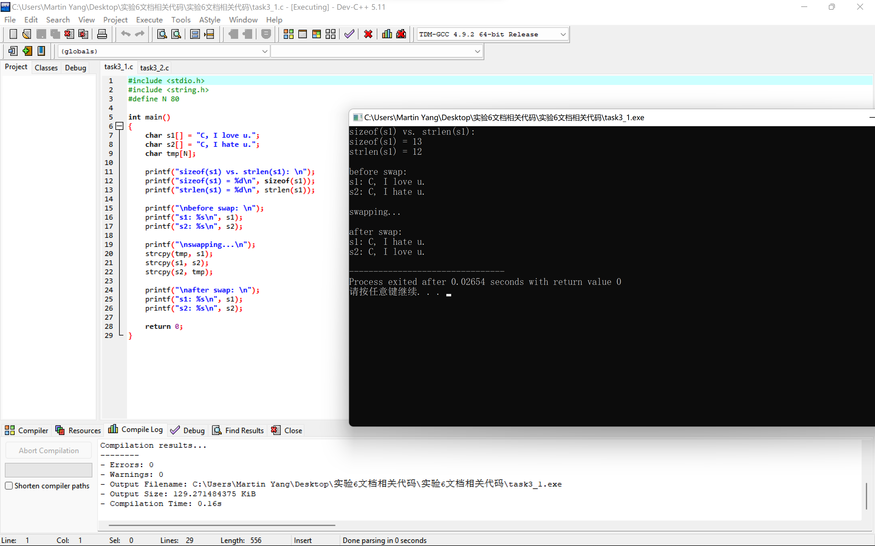 #include <stdio.h> #include <string.h> #define N 80 int main() { char s1[] = "C, I love u."; char s2[] = "C, I hate u."; char tmp[N]; printf("sizeof(s1) vs. strlen(s1): \n"); printf("sizeof(s1) = %d\n", sizeof(s1)); printf("strlen(s1) = %d\n", strlen(s1)); printf("\nbefore swap: \n"); printf("s1: %s\n", s1); printf("s2: %s\n", s2); printf("\nswapping...\n"); strcpy(tmp, s1); strcpy(s1, s2); strcpy(s2, tmp); printf("\nafter swap: \n"); printf("s1: %s\n", s1); printf("s2: %s\n", s2); return 0; }