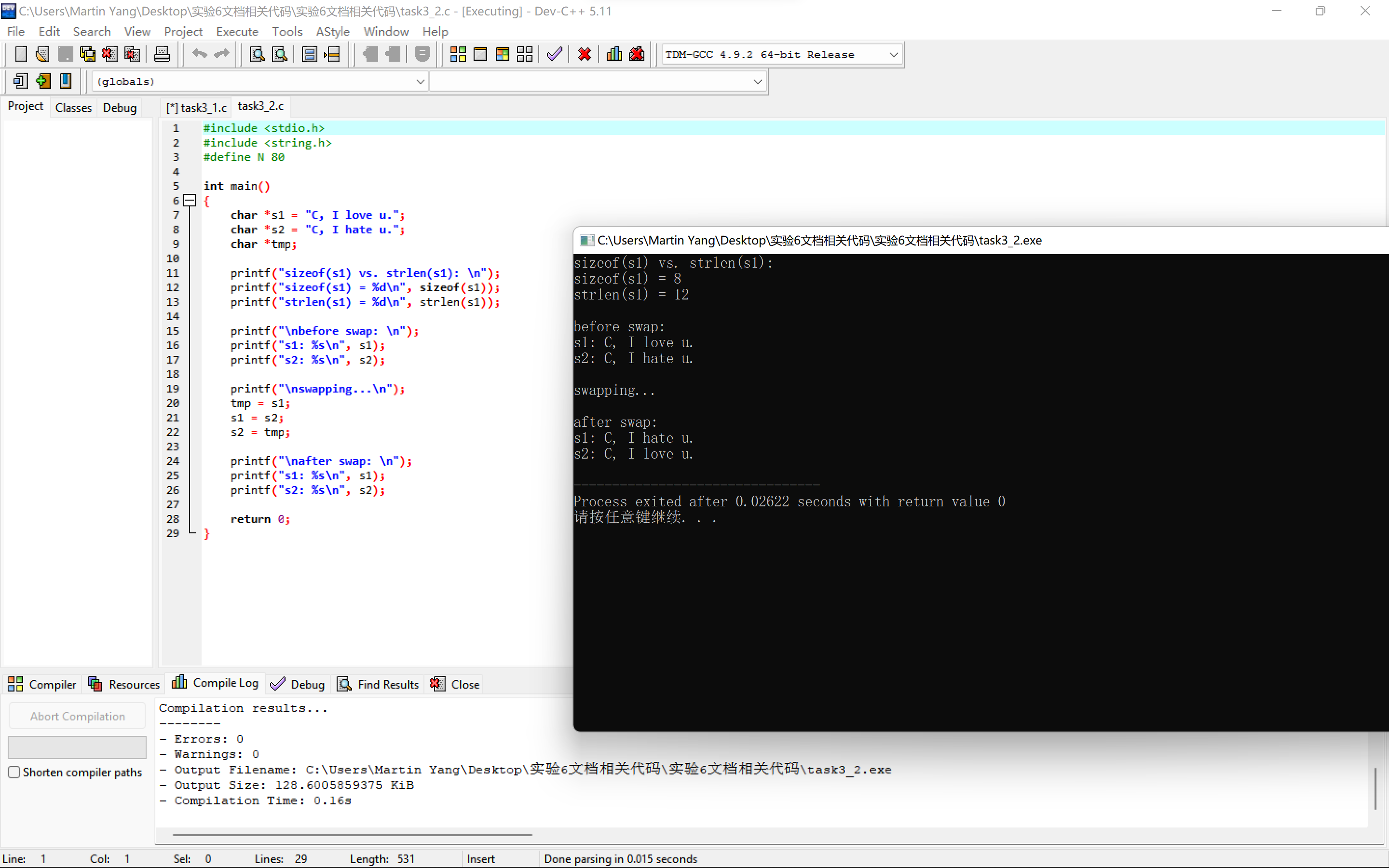 #include <stdio.h> #include <string.h> #define N 80 int main() { char *s1 = "C, I love u."; char *s2 = "C, I hate u."; char *tmp; printf("sizeof(s1) vs. strlen(s1): \n"); printf("sizeof(s1) = %d\n", sizeof(s1)); printf("strlen(s1) = %d\n", strlen(s1)); printf("\nbefore swap: \n"); printf("s1: %s\n", s1); printf("s2: %s\n", s2); printf("\nswapping...\n"); tmp = s1; s1 = s2; s2 = tmp; printf("\nafter swap: \n"); printf("s1: %s\n", s1); printf("s2: %s\n", s2); return 0; }