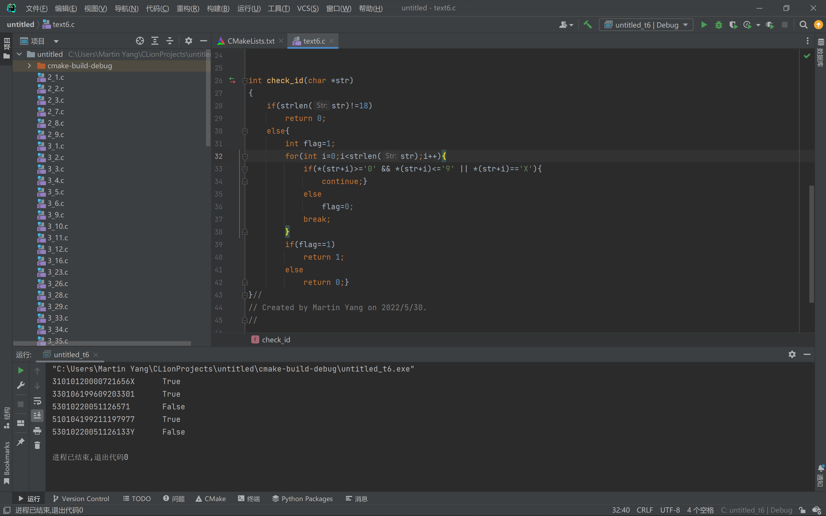 #include <stdio.h> #include <string.h> #define N 5 int check_id(char *str); // 函数声明 int main() { char *pid[N] = {"31010120000721656X", "330106199609203301", "53010220051126571", "510104199211197977", "53010220051126133Y"}; int i; for(i=0; i<N; ++i) if( check_id(pid[i]) ) // 函数调用 printf("%s\tTrue\n", pid[i]); else printf("%s\tFalse\n", pid[i]); return 0; } int check_id(char *str) { if(strlen(str)!=18) return 0; else{ int flag=1; for(int i=0;i<strlen(str);i++){ if(*(str+i)>='0' && *(str+i)<='9' || *(str+i)=='X'){ continue;} else flag=0; break; } if(flag==1) return 1; else return 0;} }// // Created by Martin Yang on 2022/5/30. //