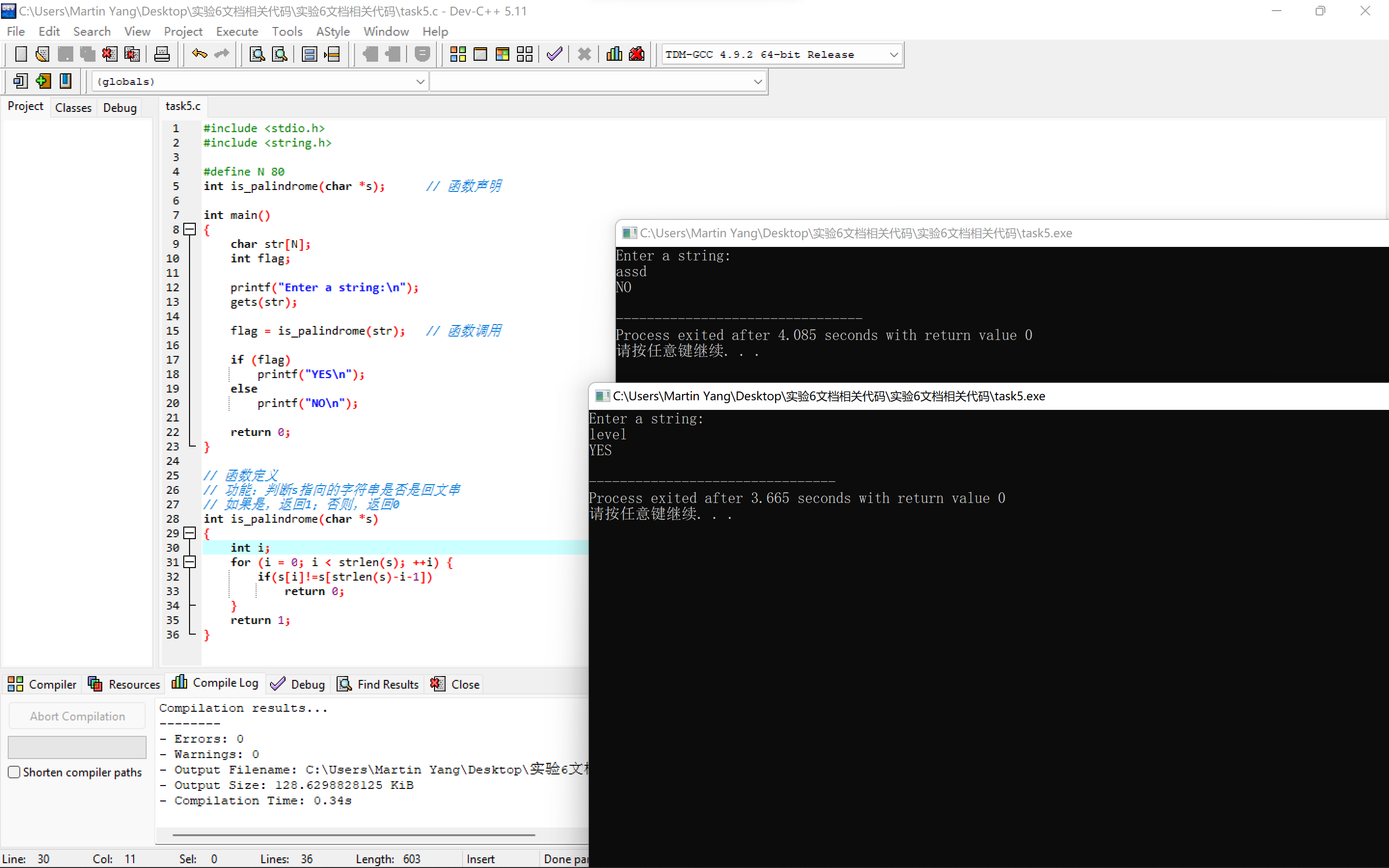 #include <stdio.h> #include <string.h> #define N 80 int is_palindrome(char *s); // 函数声明 int main() { char str[N]; int flag; printf("Enter a string:\n"); gets(str); flag = is_palindrome(str); // 函数调用 if (flag) printf("YES\n"); else printf("NO\n"); return 0; } // 函数定义 // 功能:判断s指向的字符串是否是回文串 // 如果是,返回1;否则,返回0 int is_palindrome(char *s) { for (int i = 0; i < strlen(s); ++i) { if(s[i]!=s[strlen(s)-i-1]) return 0; } return 1; }// // Created by Martin Yang on 2022/6/7. //