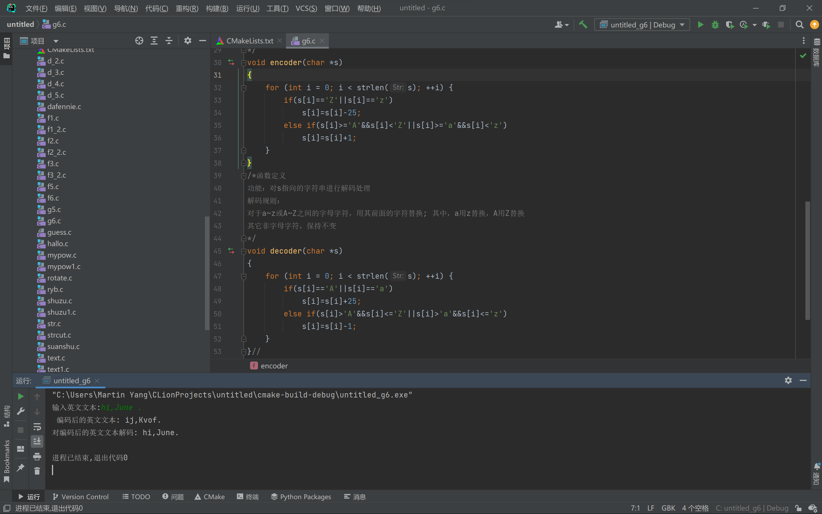 #include <stdio.h> #include <string.h> #define N 80 void encoder(char *s); // 函数声明 void decoder(char *s); // 函数声明 int main() { char words[N]; printf("输入英文文本: "); gets(words); printf("编码后的英文文本: "); encoder(words); // 函数调用 printf("%s\n", words); printf("对编码后的英文文本解码: "); decoder(words); // 函数调用 printf("%s\n", words); return 0; } /*函数定义 功能:对s指向的字符串进行编码处理 编码规则: 对于a~z或A~Z之间的字母字符,用其后的字符替换; 其中,z用a替换,Z用A替换 其它非字母字符,保持不变 */ void encoder(char *s) { for (int i = 0; i < strlen(s); ++i) { if(s[i]=='Z'||s[i]=='z') s[i]=s[i]-25; else if(s[i]>='A'&&s[i]<'Z'||s[i]>='a'&&s[i]<'z') s[i]=s[i]+1; } } /*函数定义 功能:对s指向的字符串进行解码处理 解码规则: 对于a~z或A~Z之间的字母字符,用其前面的字符替换; 其中,a用z替换,A用Z替换 其它非字母字符,保持不变 */ void decoder(char *s) { for (int i = 0; i < strlen(s); ++i) { if(s[i]=='A'||s[i]=='a') s[i]=s[i]+25; else if(s[i]>'A'&&s[i]<='Z'||s[i]>'a'&&s[i]<='z') s[i]=s[i]-1; } }// // Created by Martin Yang on 2022/6/7. //