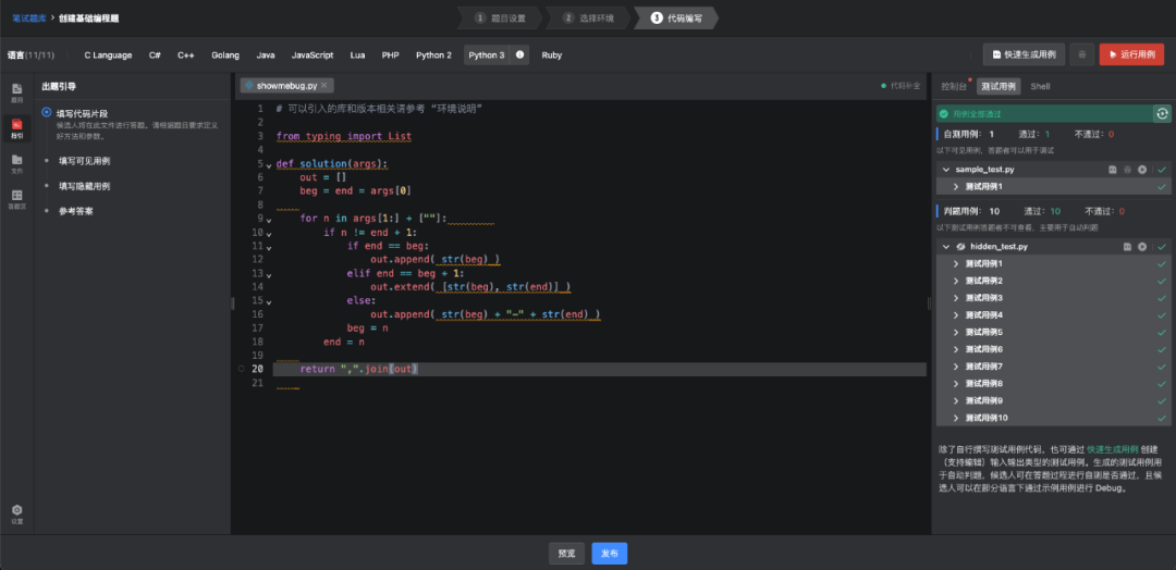 一是测试用例正确性:ShowMeBug 集成了所有语言最主流的测试用例,题目自动内置示例用例与隐藏用例。这是一个非常客观的针对正确性的评估。