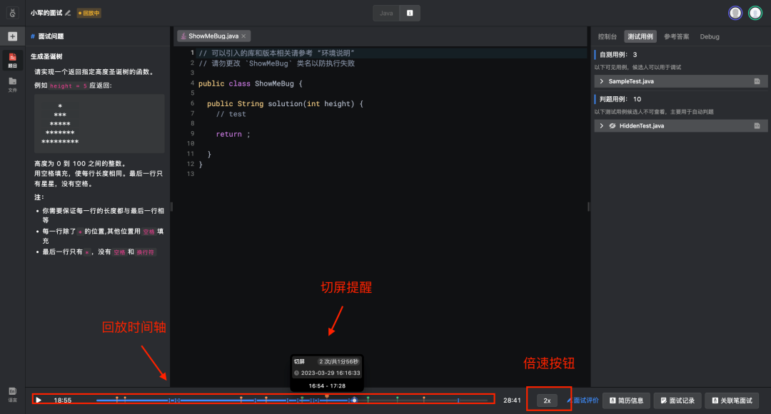 ShowMeBug 团队认真研究了三年,基于完全自研强大的 IDE 引擎,最行之有效的核心方法就是抽象出一个合适难度的任务,给予候选人一定的时间,进行代码构思、类结构设计、数据库设计、或者前端页面布局设计。然后通过三种方式进行综合评估。