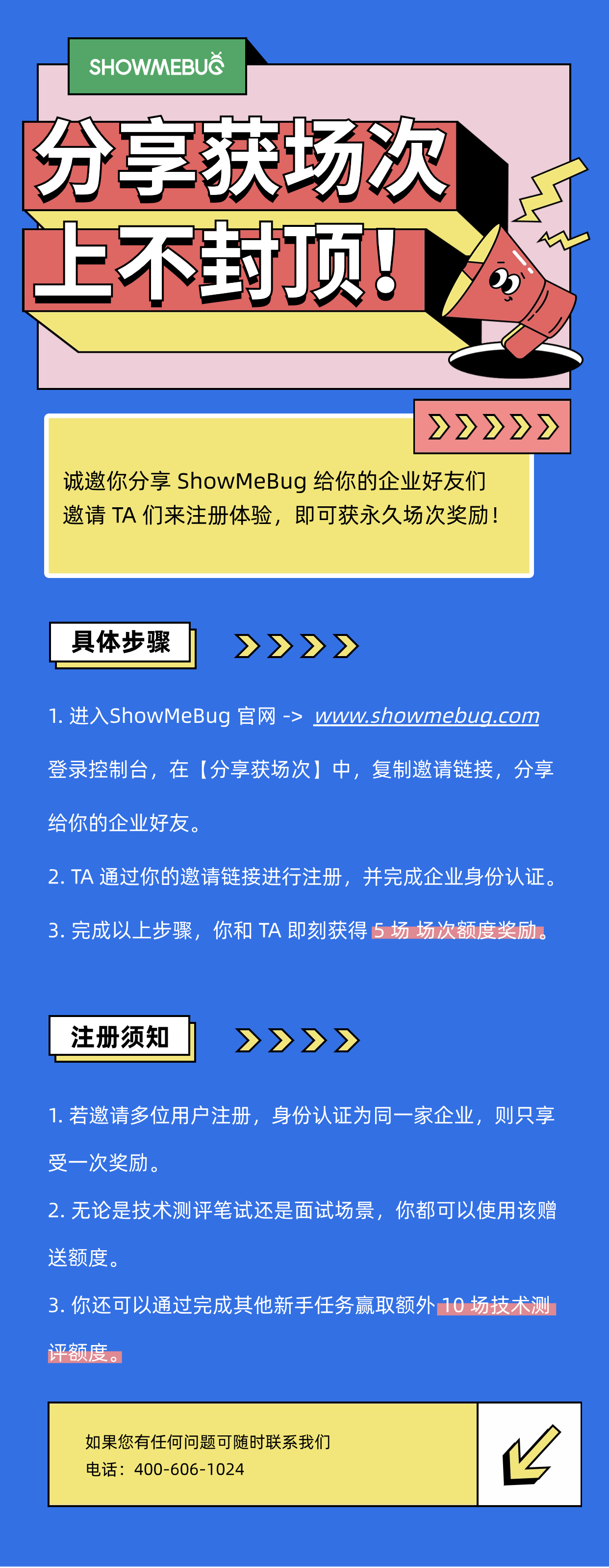 同时,ShowMeBug 特别推出“分享获场次”活动,旨在为技术招聘注入新活力,实现高效、便捷的成本优化。活动详情及规则详见下方海报。