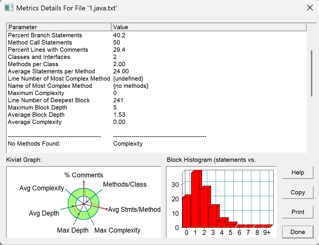 方法数量与分布:虽然报告提到 “Methods per Class” 为 2.00,但整体没有检测到方法,这可能意味着类中的方法定义不规范或者存在语法错误,从而导致指标工具无法识别。 - 代码复杂度问题