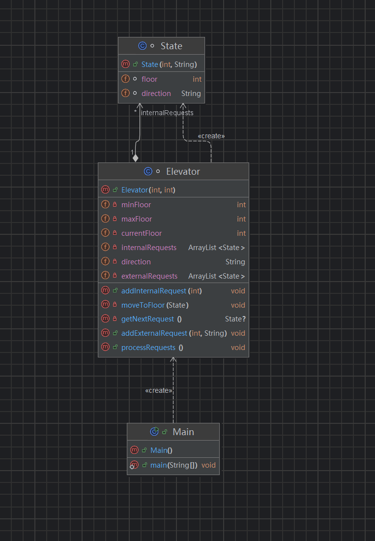 Passenger 类:请求队列管理器。internalRequests:管理电梯内部乘客的楼层请求(无方向)。externalRequests:管理电梯外部候梯人员的请求(含方向)。在添加请求时检查楼层是否在有效范围(minFloor~maxFloor),过滤无效请求。提供 removeRequest 方法移除已处理的请求,确保队列中仅包含待处理任务。