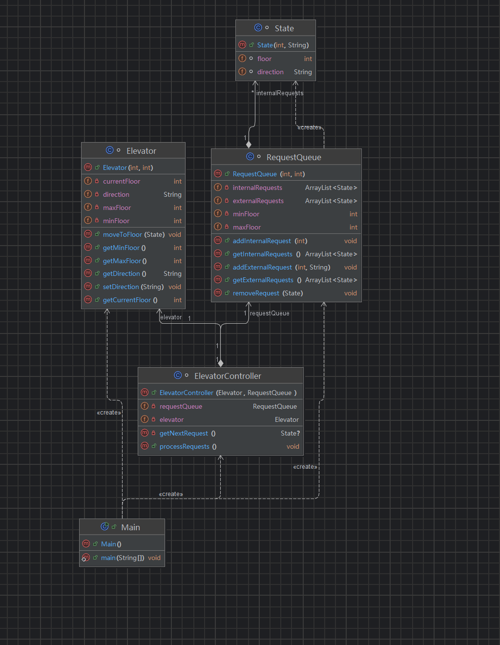 ElevatorController 类:电梯调度核心。关联 Elevator 和 RequestQueue,作为两者的桥梁。processRequests 循环处理请求队列中的任务,直至队列为空。getNextRequest 根据电梯当前状态(楼层、方向)选择下一个处理的请求,实现简单的调度策略(方向优先、距离优先)。