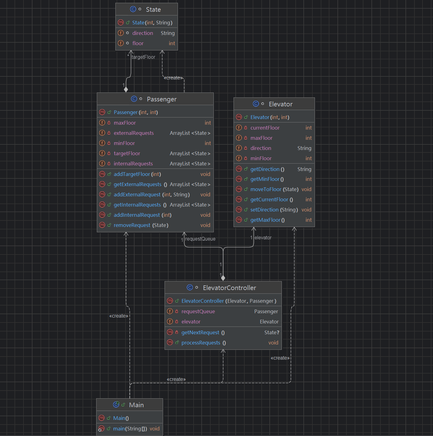 1.2.1题目要求:对之前电梯调度程序进行迭代性设计,目的为解决电梯类职责过多的问题,类设计要求遵循单一职责原则(SRP),要求必须包含但不限于设计电梯类、乘客请求类、队列类以及控制类。电梯运行规则与前阶段单类设计相同,但要处理如下情况: