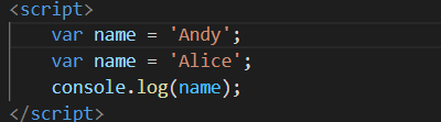 这是我在vscode编辑器上写的三行代码,上面代码在控制台上的输出是Alice,该值被赋给最后声明的name变量。因此可以说明var定义的变量可以修改。但是,如果只用var声明而不赋值的话,将会输出undefined,但不会报错。如: