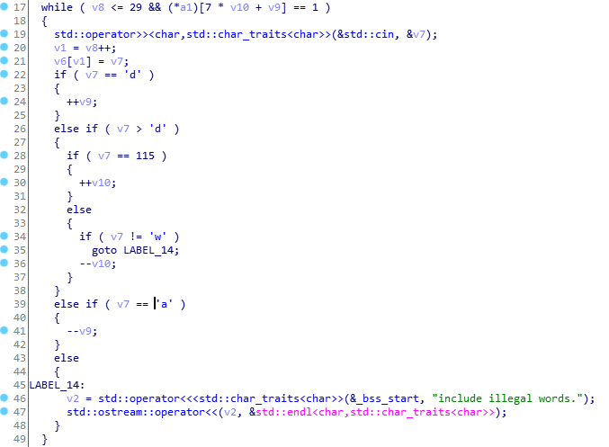 使用了w、a、s、d表示上下左右,我们输入这四个字母对应正确的迷宫路径就是flag,那么得到迷宫就是关键了,我们可以直接在step_3设断点、调试时查看step_1、2运行后的迷宫。